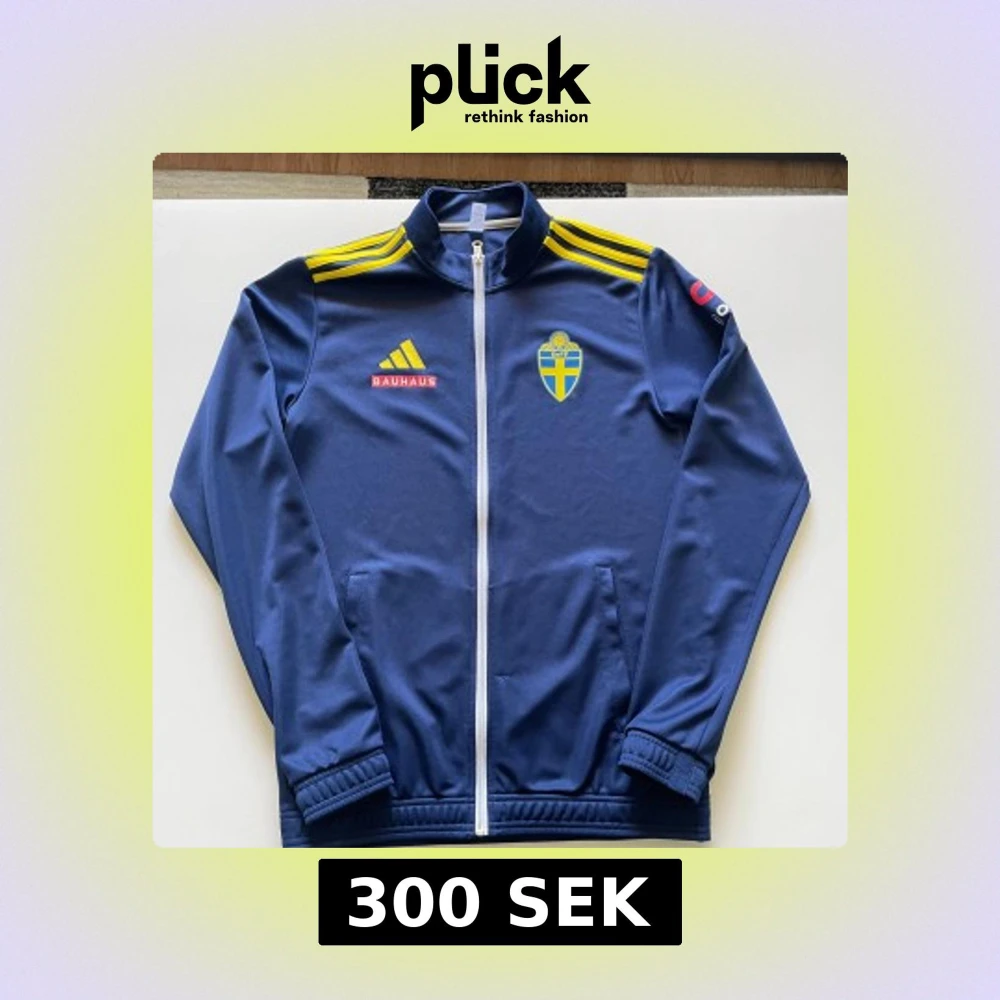Blå ziptröja från adidas med svenska landslagets emblem på bröstet, gula ränder på axlarna och Bauhaus-logga. Långärmad modell med hög krage och vita dragkedjor. Perfekt för fotbollsträning eller som supporterplagg.
