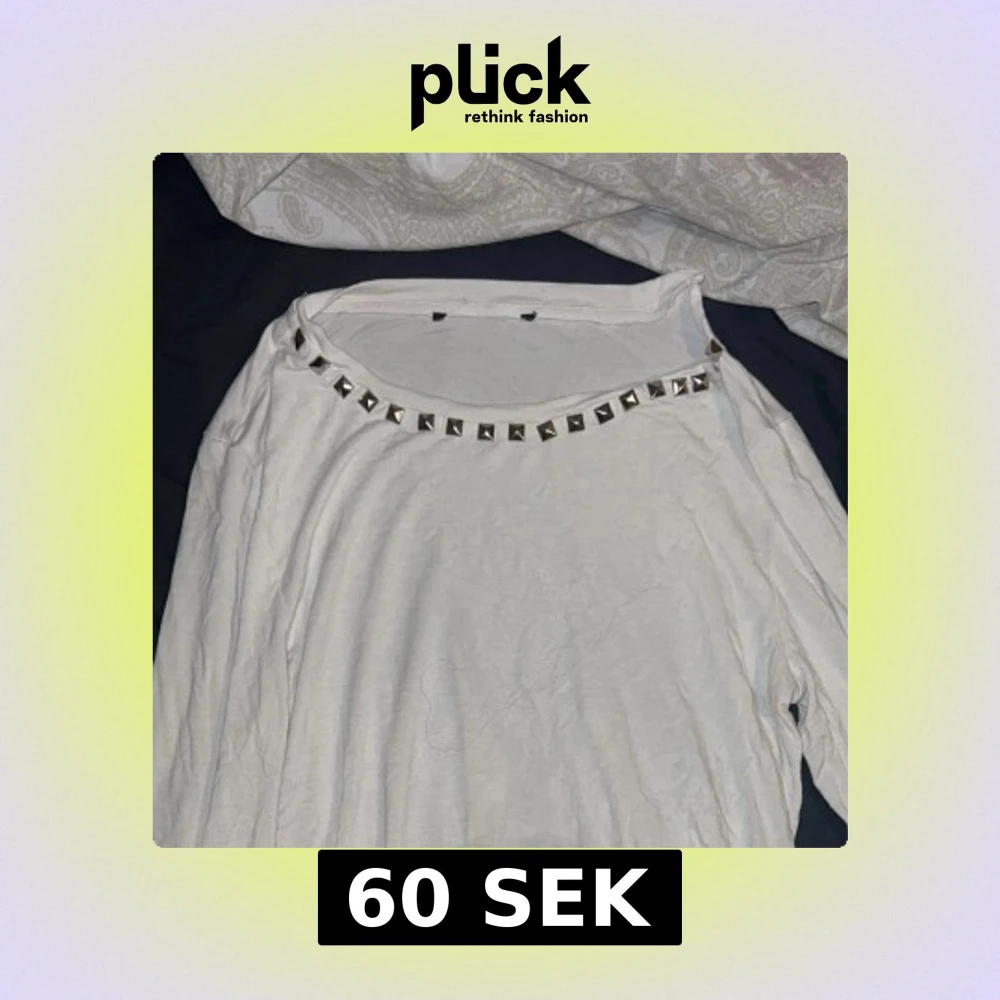 Säljer en vit långärmad tröja med coola silverfärgade nitar längs halsringningen och unik knytning i ryggen. Tröjan har en loose passform och är tillverkad i mjuk bomull. Perfekt för dig som gillar edgy detaljer och vill sticka ut.