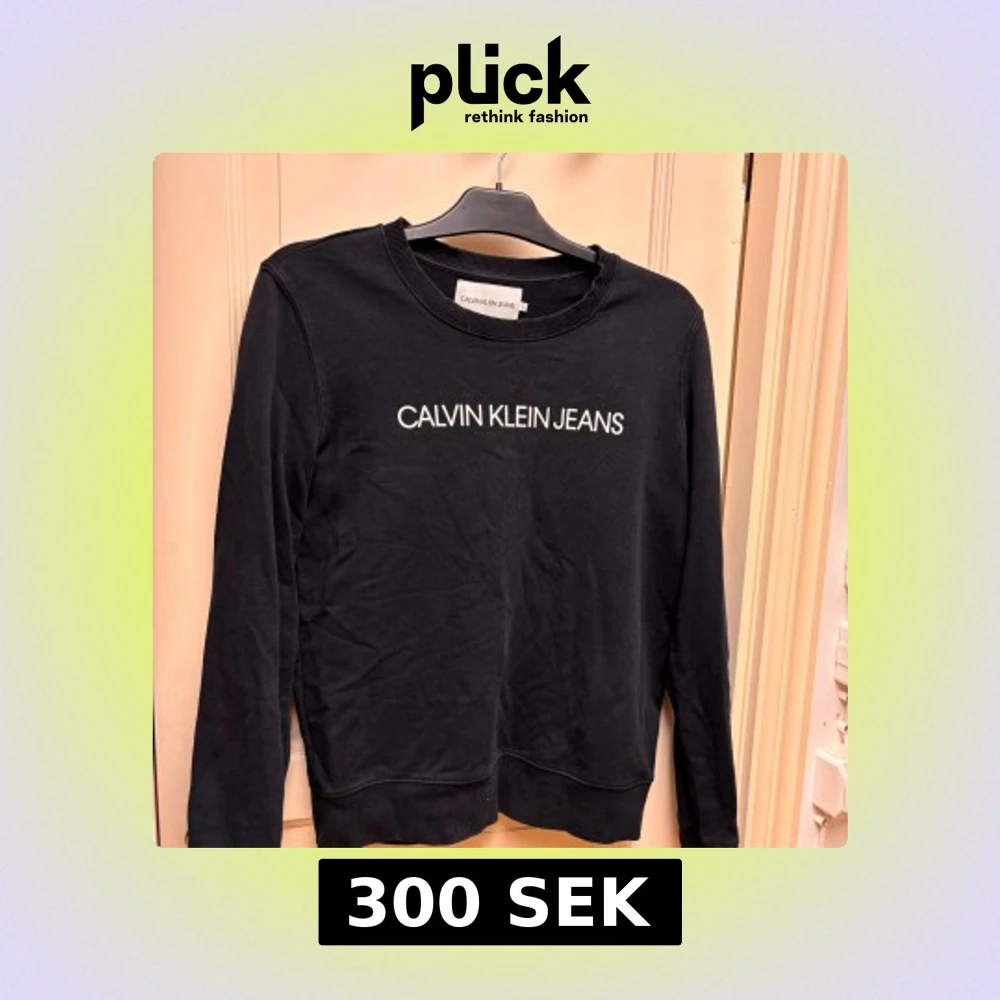 Svart sweatshirt från Calvin Klein Jeans i storlek L med vit logotyp framtill. Klassisk rund halsringning och långa ärmar. Tillverkad i mjuk bomull för en skön och avslappnad stil. Har ett litet hål vid axeln bak men lätt fixat om man vill!