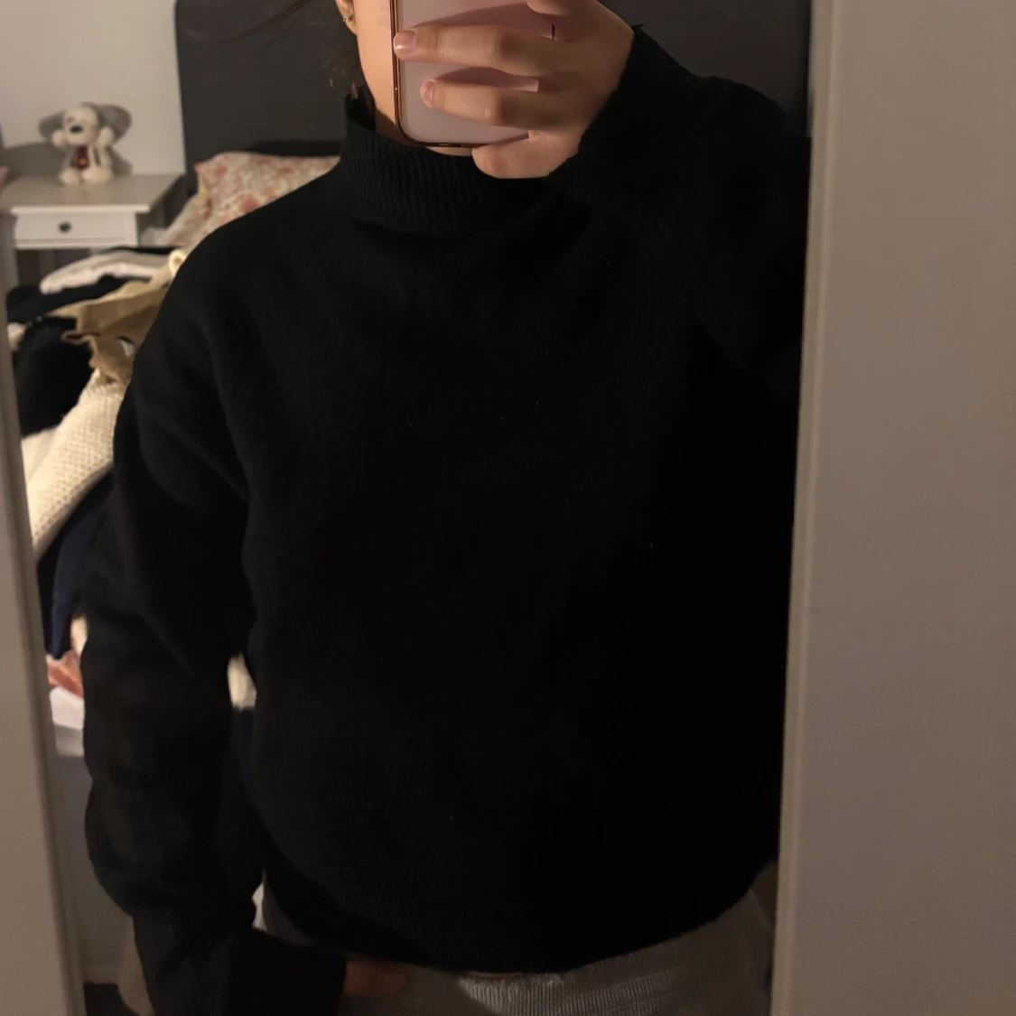 Säljer en svart polotröja med lång ärm. Perfekt baströja med hög krage som passar till många olika outfits. Enkel och stilren design.