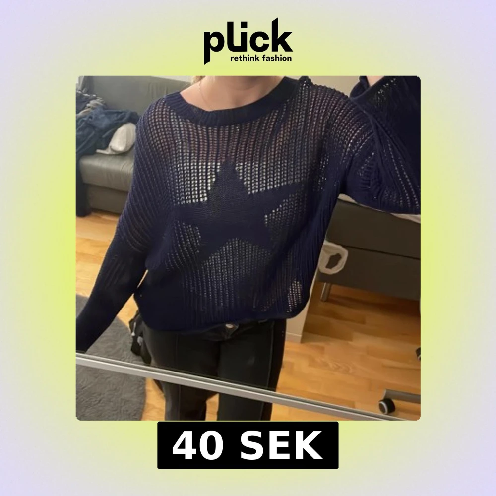 Säljer en mörkblå stickad tröja med stjärnmönster på framsidan. Inga defekter med tröjan och sparsamt använd. Den är genomskinlig och ger en trendig och Y2k look!