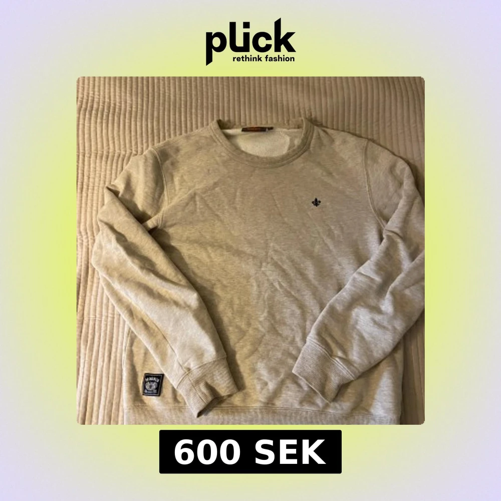 Säljer en stilren beige sweatshirt från Morris Stockholm med rund halsringning och diskret logga på bröstet. Tröjan har ribbade muddar och en patch nertill. Perfekt för dig som gillar klassisk och enkel stil.