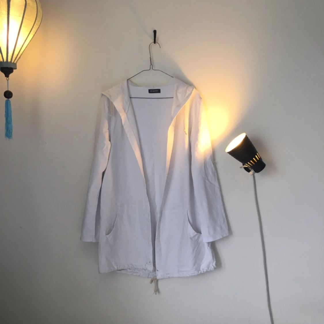 Vit, lite glittrig kofta. Blir glittrigare ju längre ner på tröjan man tittar. Inte glittrig baktill men snygg fade. Aldrig använd.