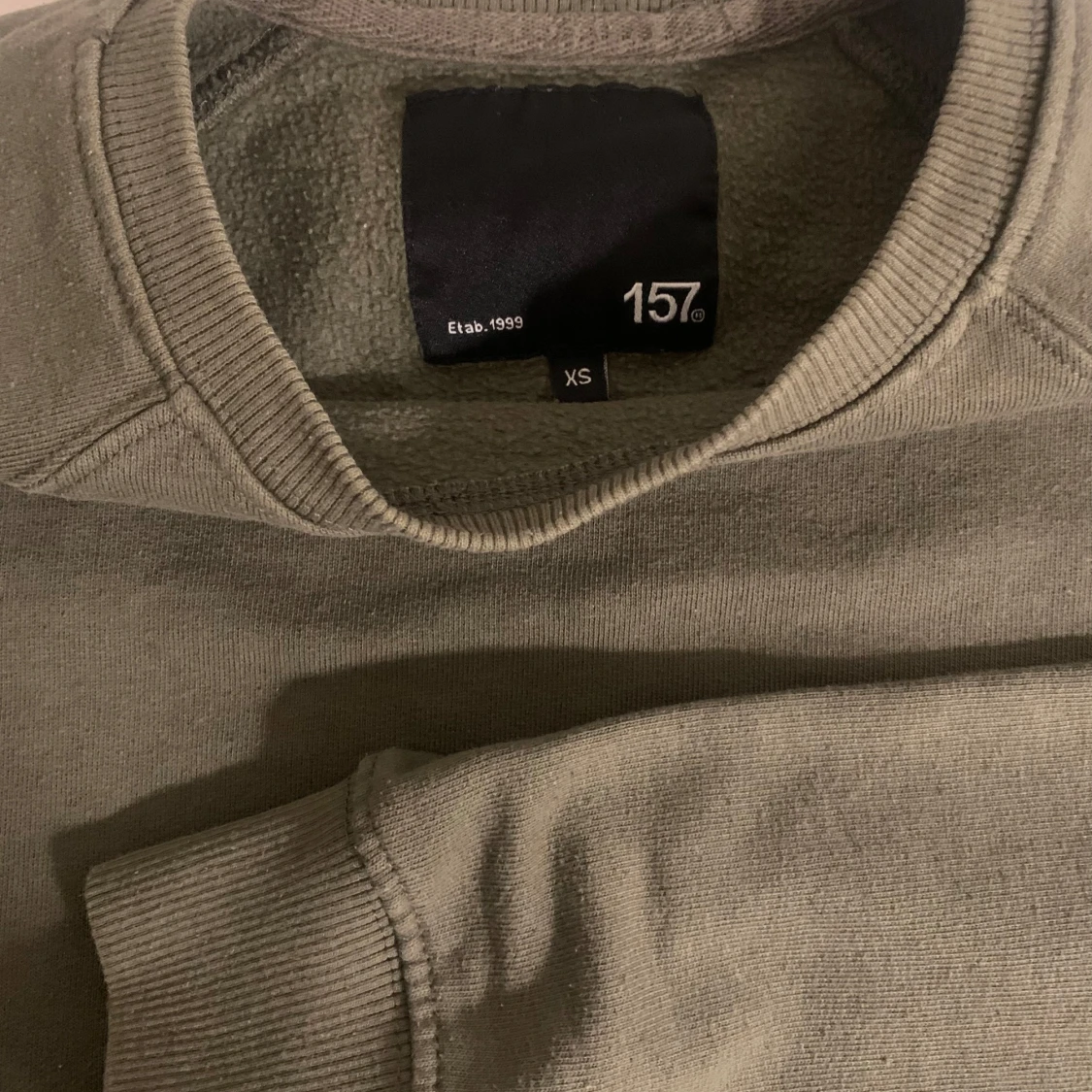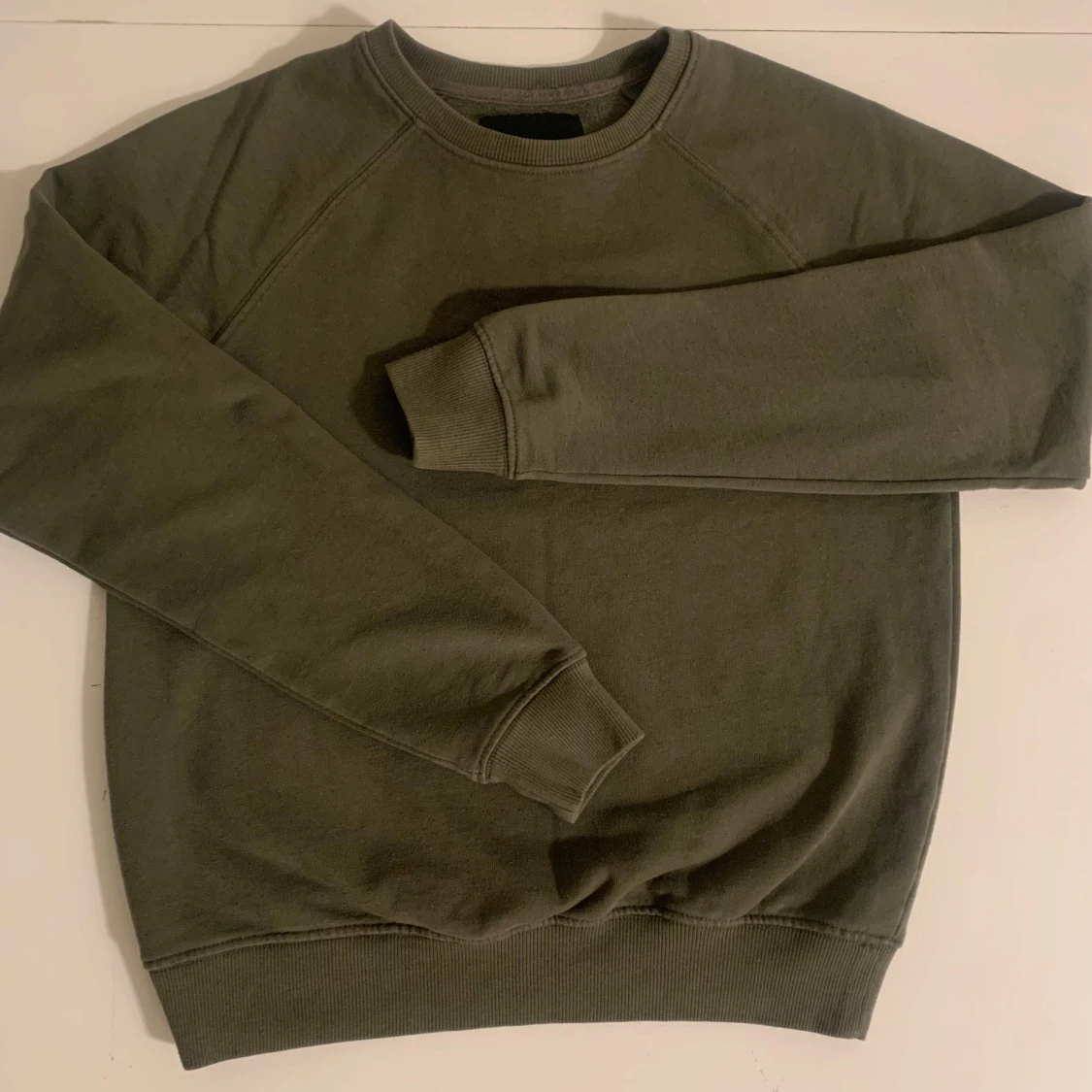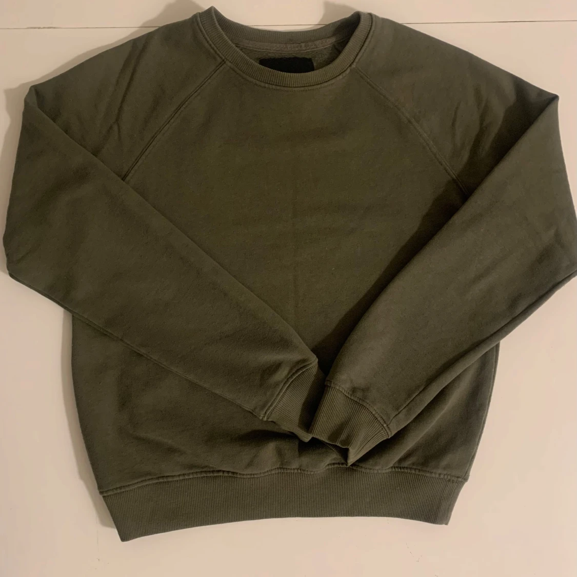 Säljer en stilren olivgrön sweatshirt från lager 157. Tröjan har en klassisk rund halsringning och långa ärmar med ribbade muddar. Perfekt för en avslappnad look.