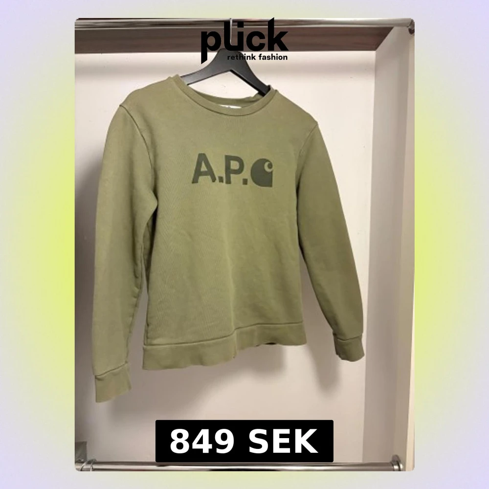 Snygg olivgrön sweatshirt från A.P.C. Carhartt WIP i storlek S. Själv skulle jag säga att tröjan är i XS, samt att lite av A:et har försvunnit vilket leder till det billiga priset. Pris kan diskuteras