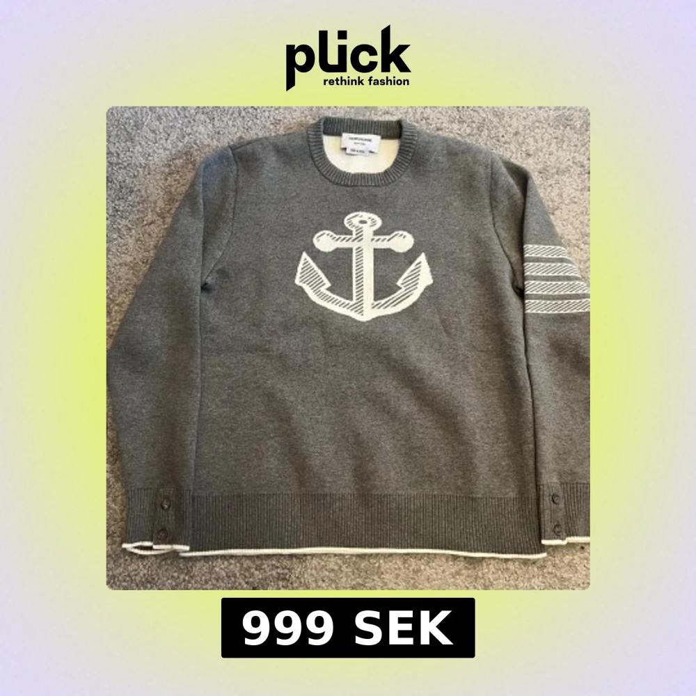 Snygg grå tröja från Thom Browne med stort vitt ankare på bröstet och vita ränder på ena ärmen. Tröjan har ribbade muddar, rund hals och knappar vid sidorna. Perfekt för dig som gillar stilrena detaljer och marint tema.