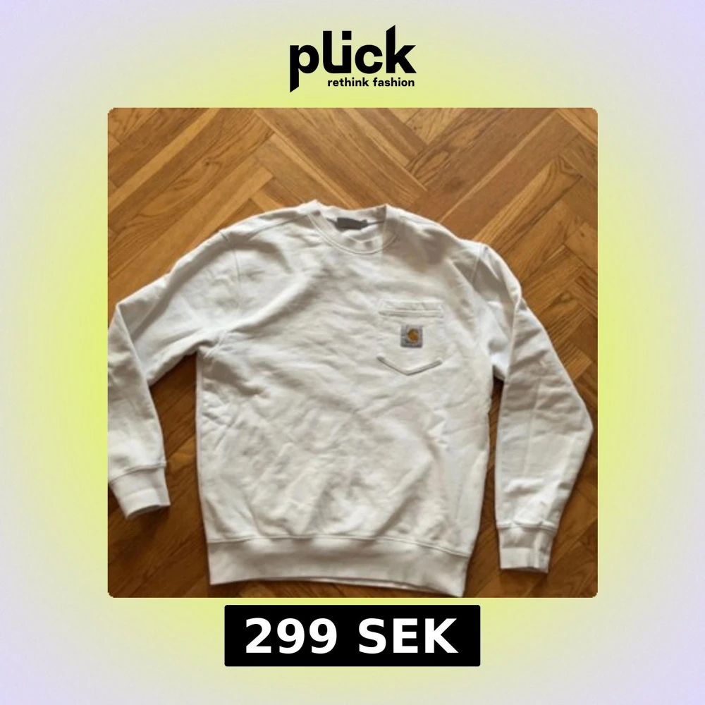 Säljer en vit sweatshirt från Carhartt med rund halsringning och en bröstficka med logotyp. Tröjan har långa ärmar och ribbade muddar vid ärmslut och nederkant. Perfekt för en avslappnad stil.