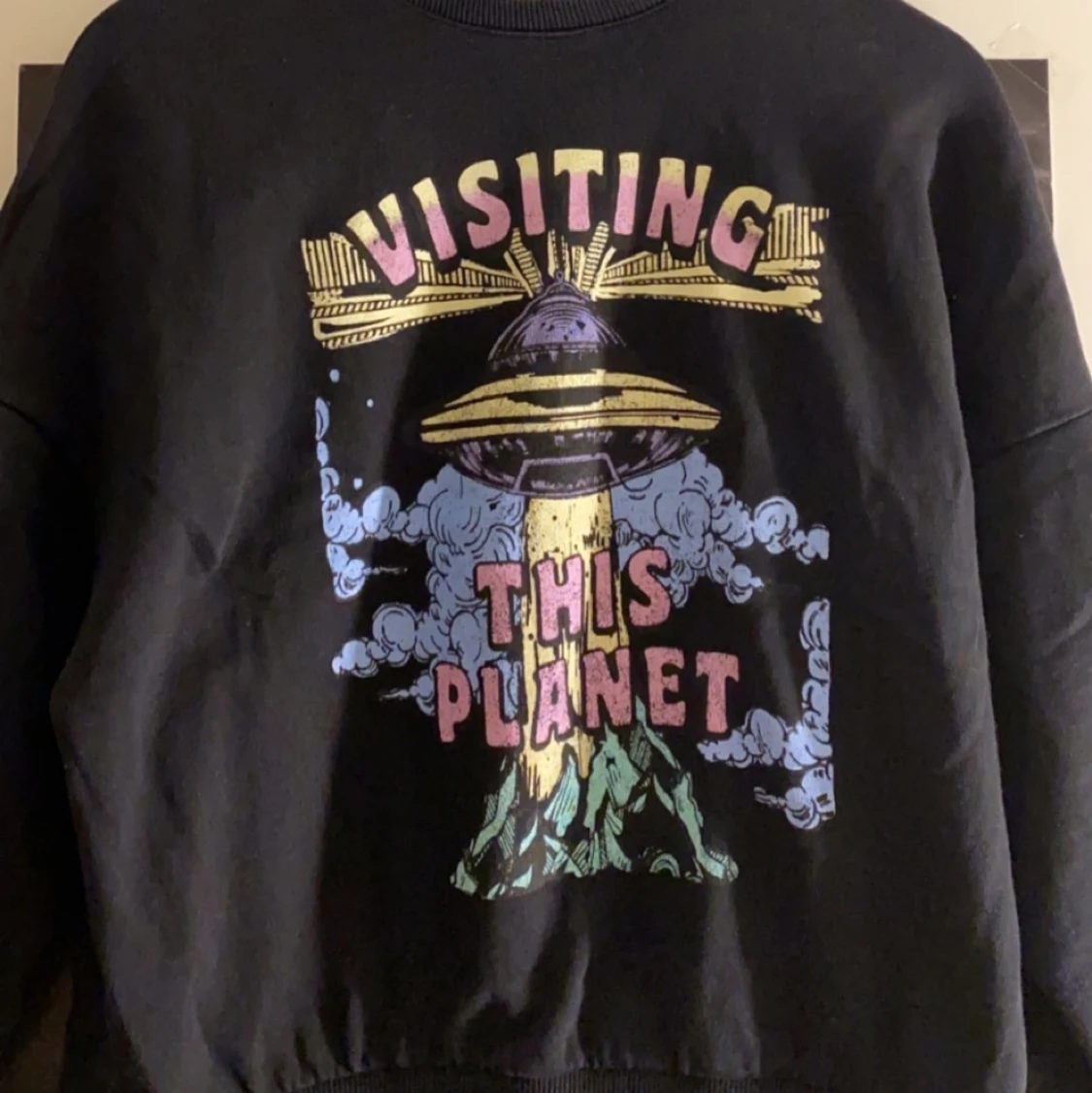 Svart sweatshirt med ett typ rymd/Alien-tryck, som jag köpte för ett tag sen, men tyvärr inte fått så mycket användning för 👽 bra skick! Inga defekter eller så. Jag fraktar!