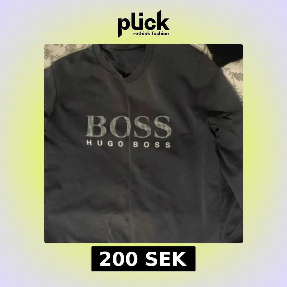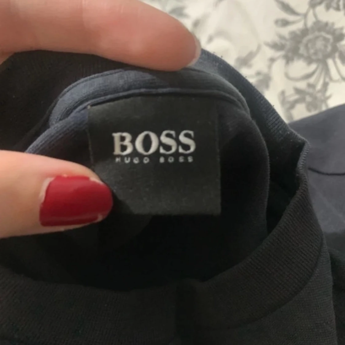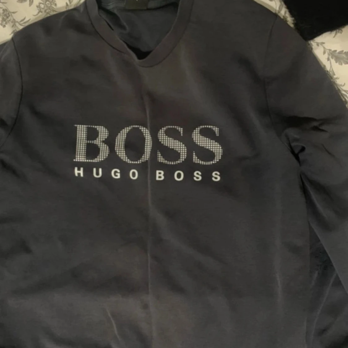 Svart/väldigt mörk blå sweatshirt från Hugo Boss med stort BOSS-tryck i vitt framtill. Klassisk rund halsringning och långärmad modell. Tröjan är lite skadad vid ena armbågen, men det är inte så synligt (se bild ovan)