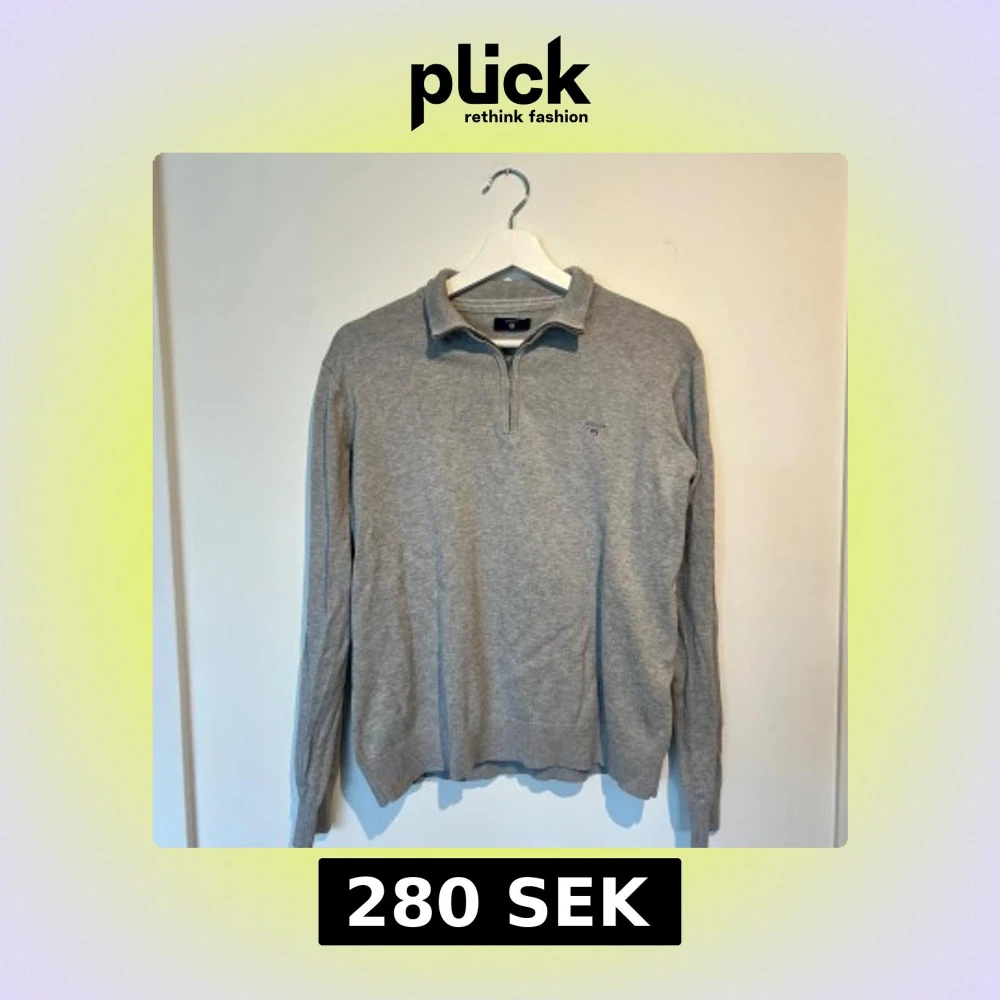 En grå stickad tröja från Gant med half-zip klassisk krage. Sparsamt använd och fint skick.