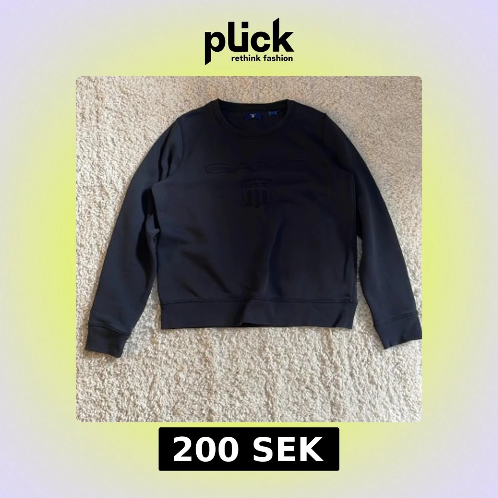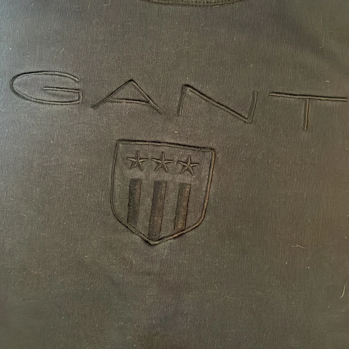 Säljer en svart sweatshirt från Gant med diskret broderad logga och sköld på bröstet. Tröjan har rund halsringning och långa ärmar. Perfekt för en stilren och enkel look.