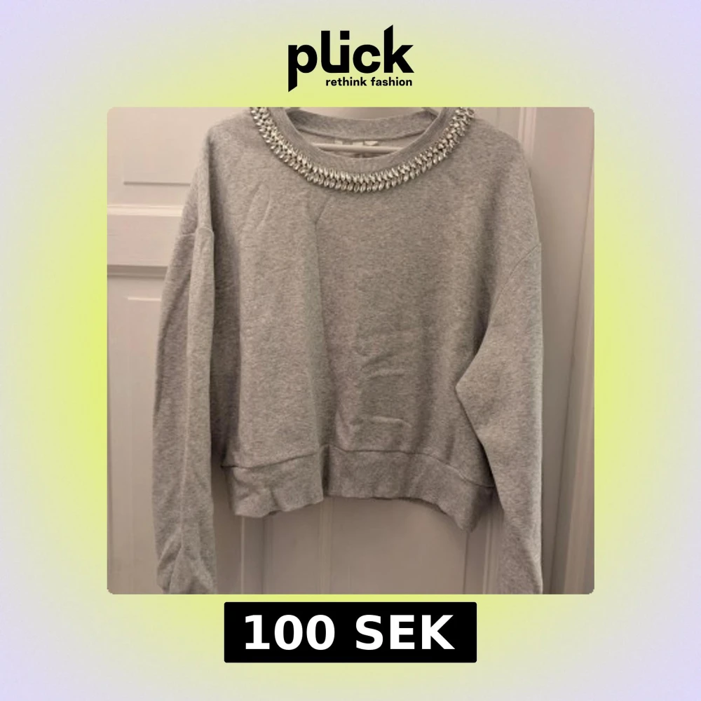 Supersnygg grå sweatshirt från H&M i storlek XL med glittriga stenar runt halsringningen som ger en extra touch. Tröjan har lång ärm, ribbade muddar och är gjord i mjuk bomullsmix. Perfekt för dig som gillar att sticka ut med detaljer!