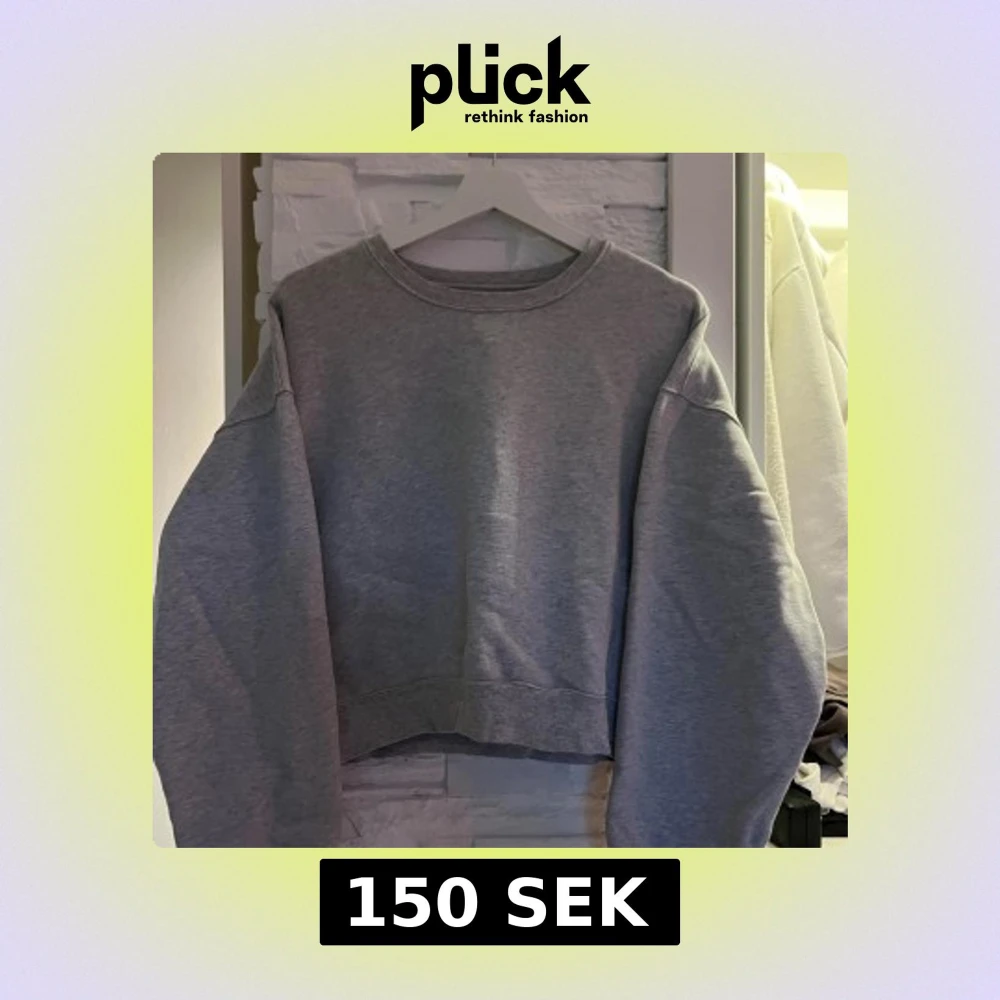 Säljer en grå croppad sweatshirt från BikBok med oversized passform och långa ärmar. Tröjan har en klassisk rund halsringning och är tillverkad i mjuk bomullsblandning, perfekt för chill dagar eller när du vill ha en enkel och stilren look.
