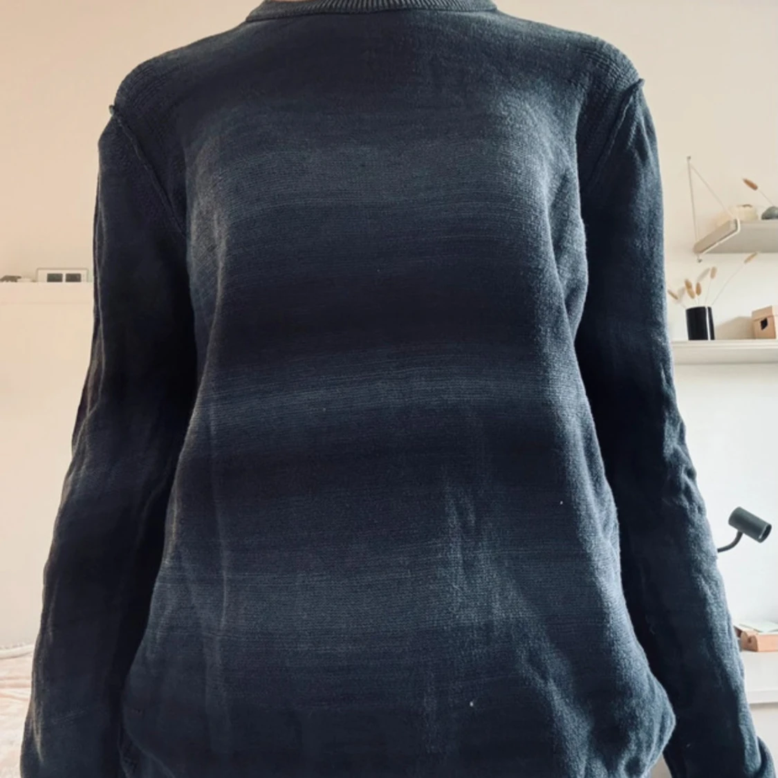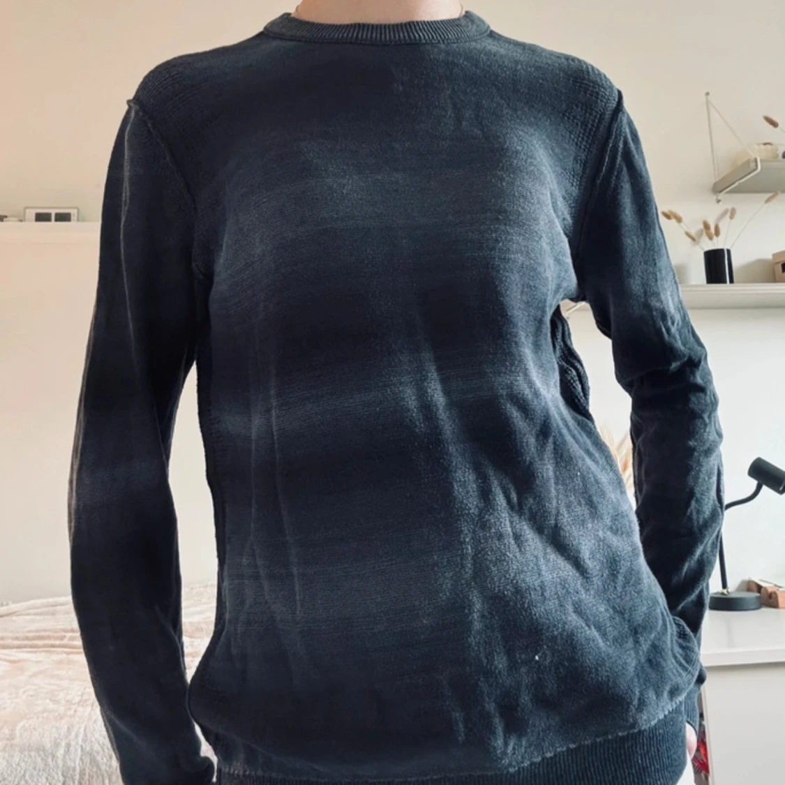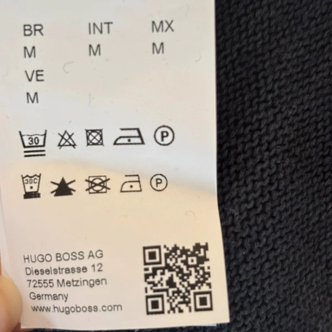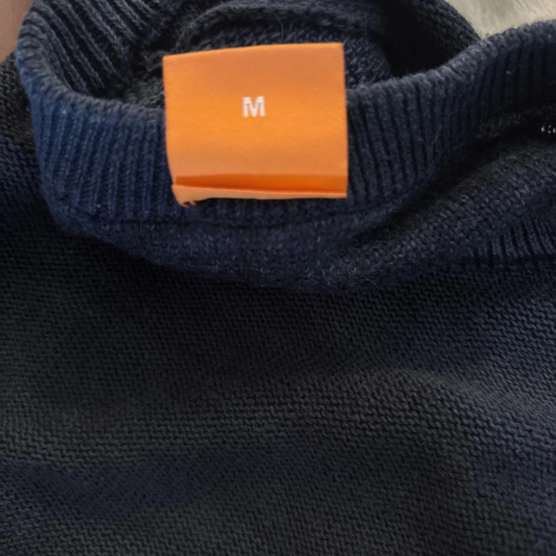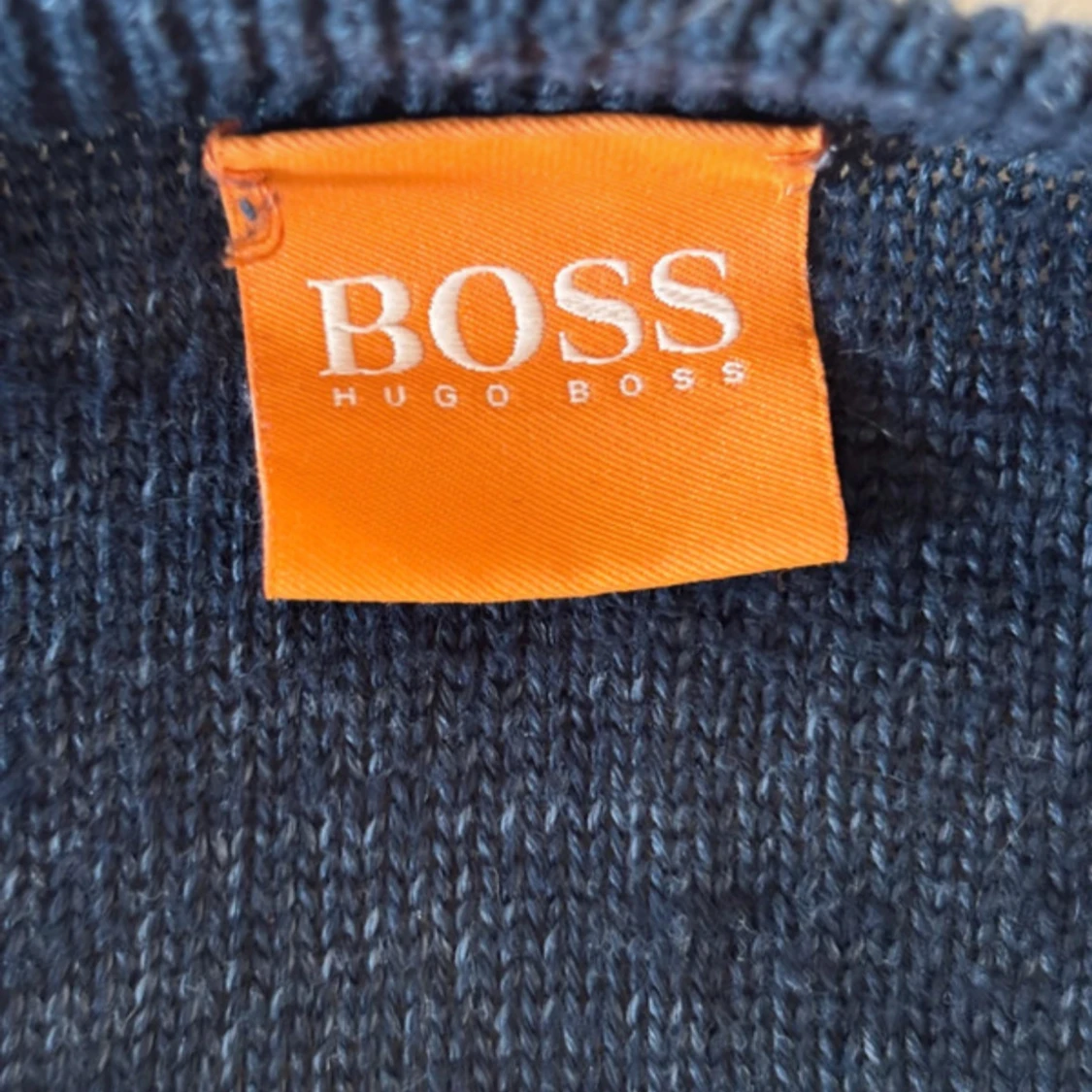 Snygg mörkblå stickad tröja från Hugo Boss i klassisk modell. Tröjan har rund halsringning, långa ärmar och en diskret melerad effekt i tyget.