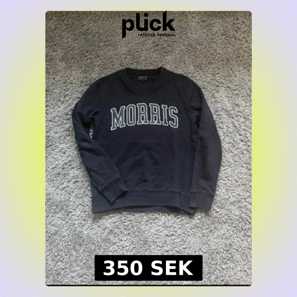 Snygg mörkblå sweatshirt från Morris i storlek M. Tröjan har ett klassiskt college-tryck med MORRIS i vitt över bröstet och ribbade muddar vid hals, ärmslut och nederkant. Perfekt för en chill och stilren look.