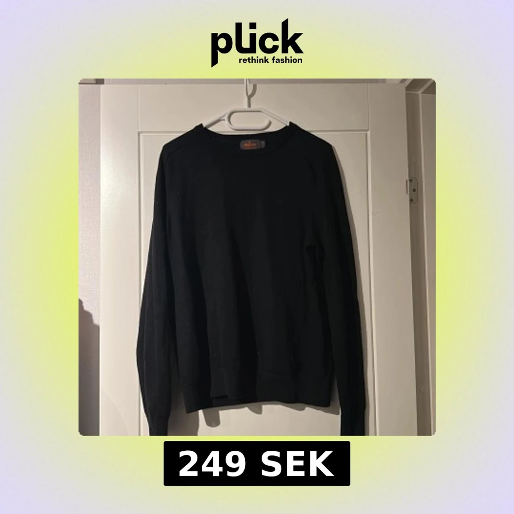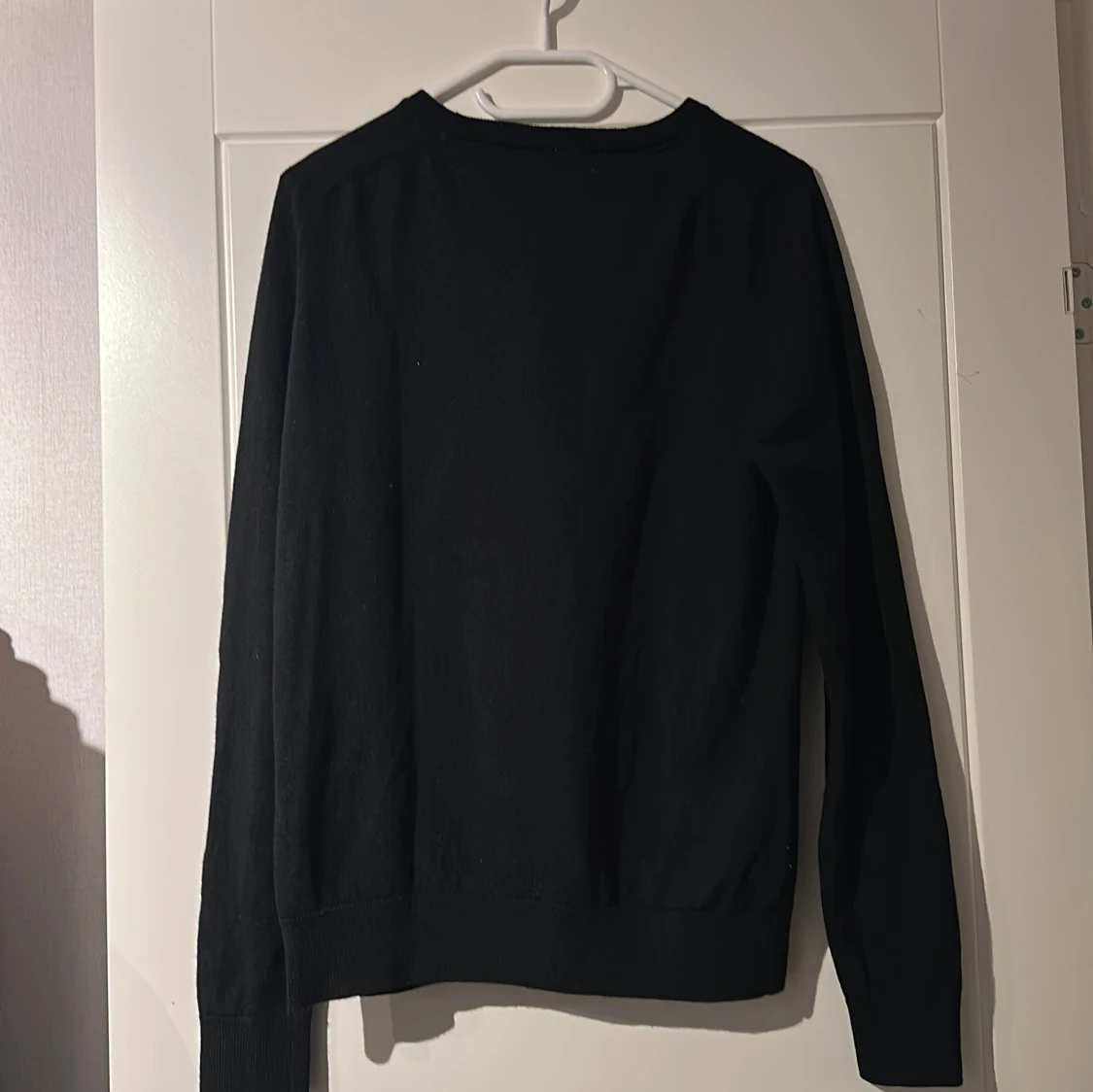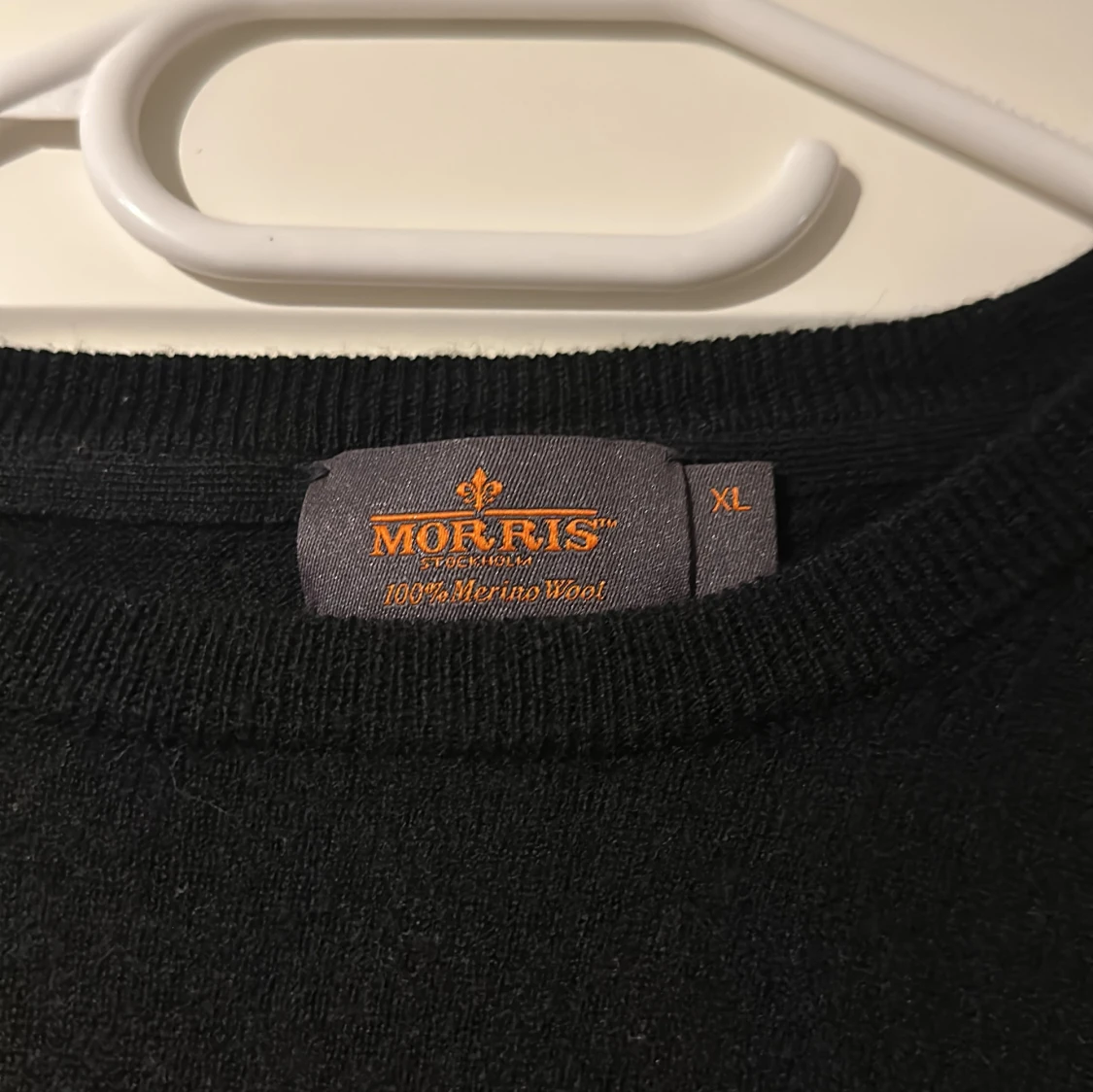 Säljer en stilren svart tröja från Morris i 100% merinoull. Storlek XL men passar S eftersom den krympt. Tröjan har en klassisk design med långa ärmar och rund halsringning. Perfekt för kyligare dagar och ger en elegant touch till din outfit.