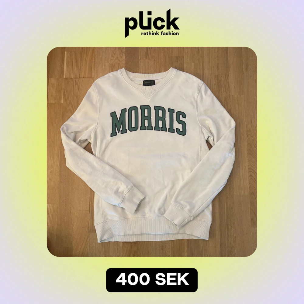 Vit sweatshirt med grönt tryck framtill. Från Morris. Tröjan har en rund halsringning och långa ärmar. Storlek M. Har en liten diskret fläck (se bild 3)