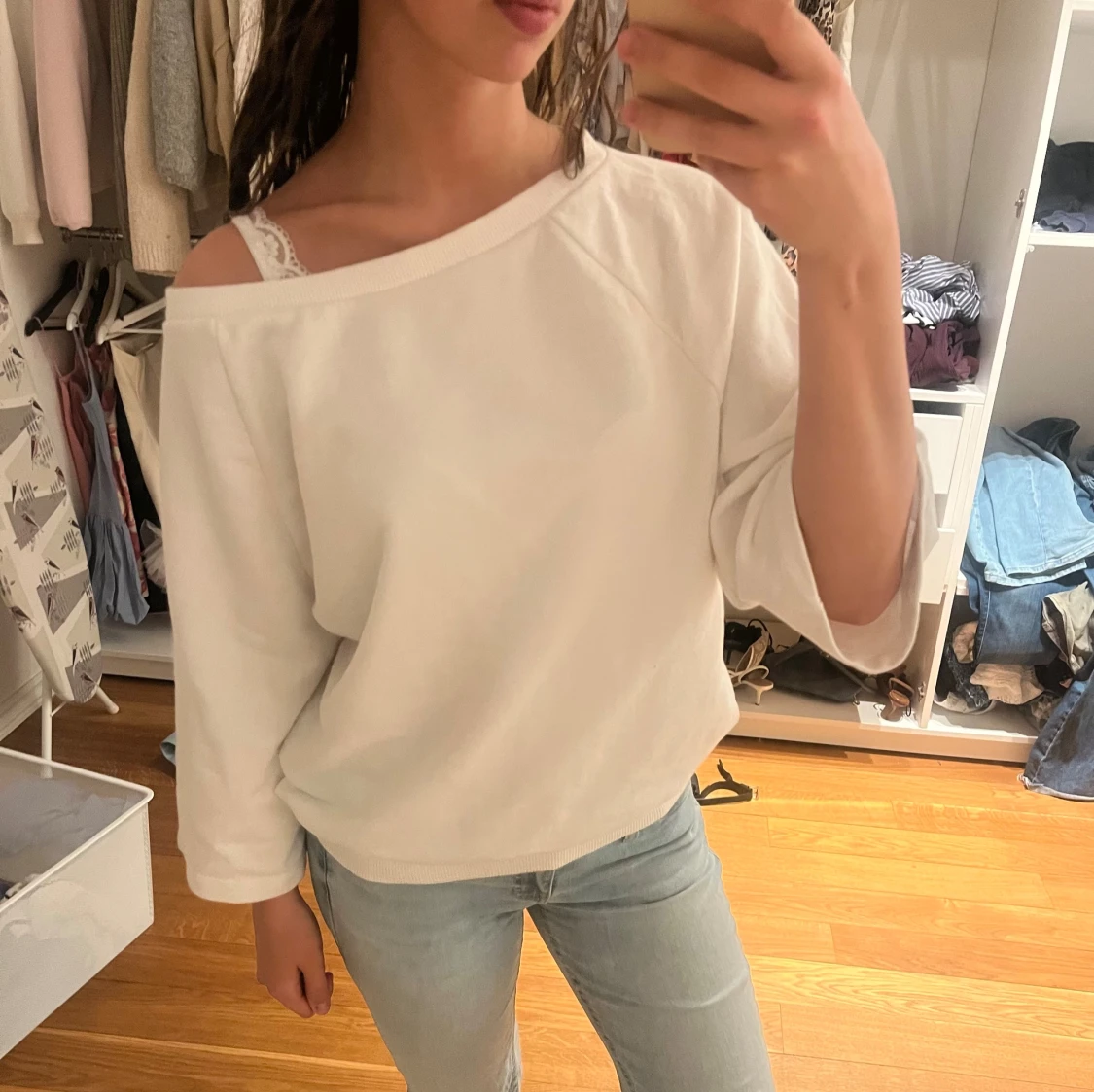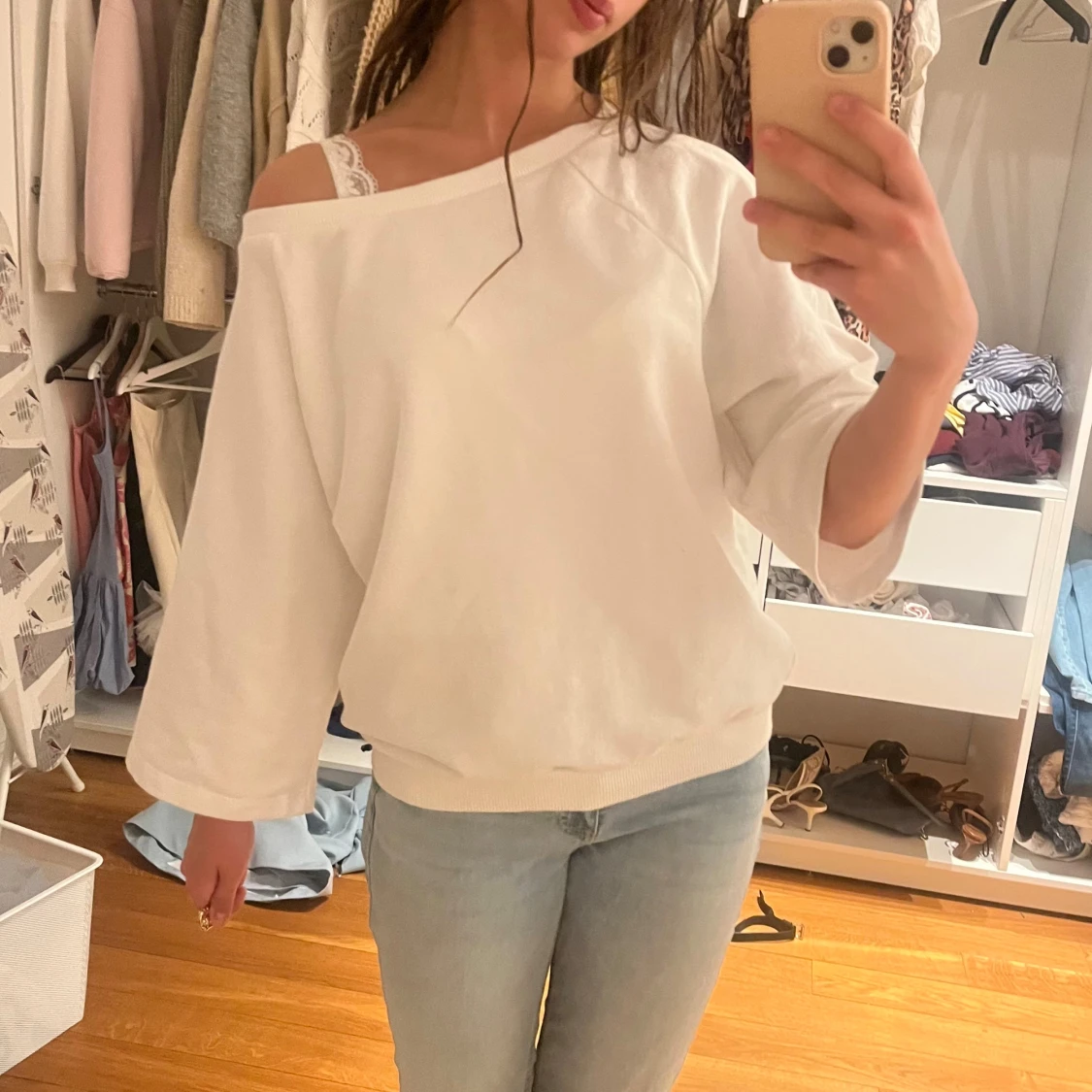Vit tröja från Nelly med offshoulder-design och vida, trekvartsärmar. Tröjan har en avslappnad passform och är gjord i mjukt bomullsmaterial. Perfekt för dig som gillar en chill och stilren look.