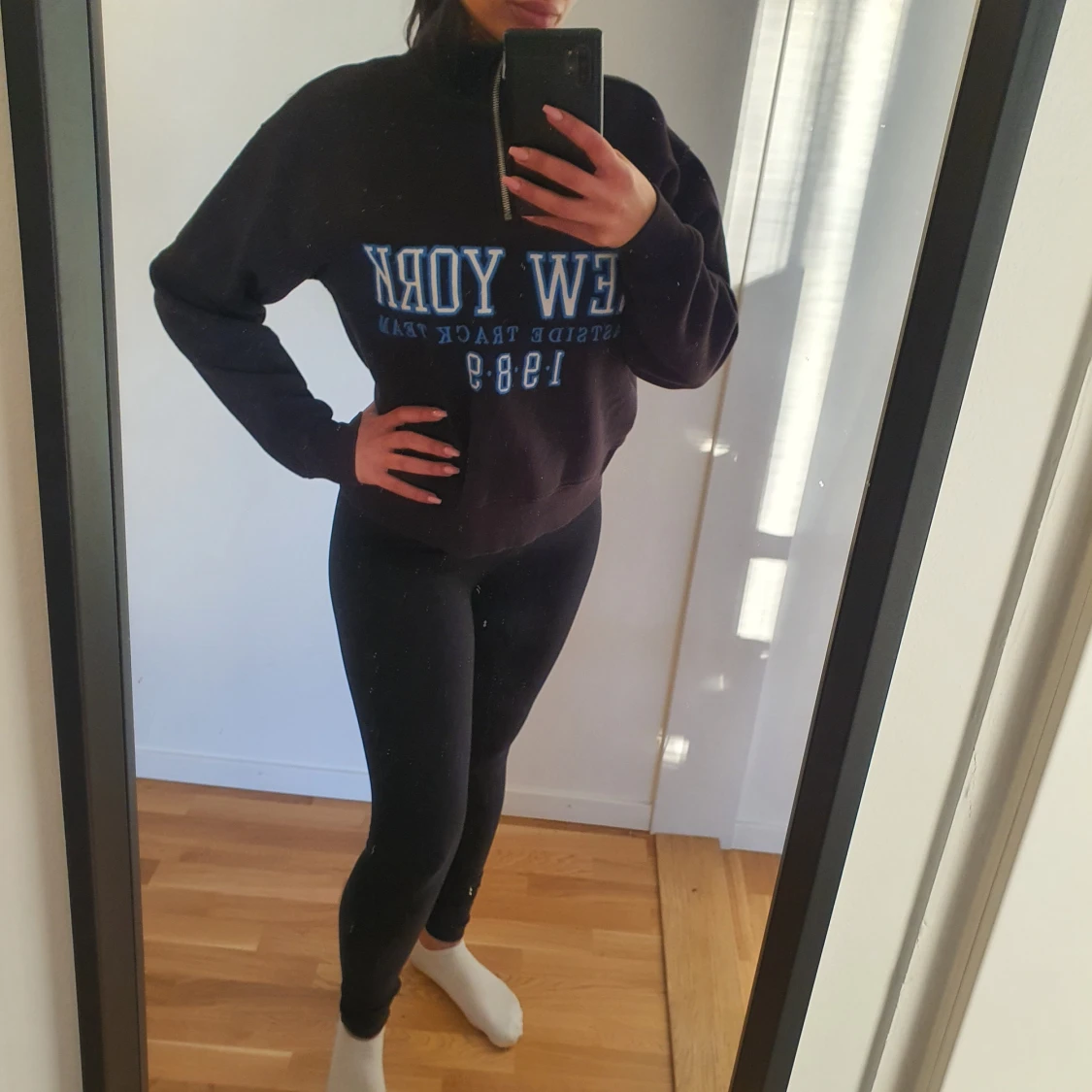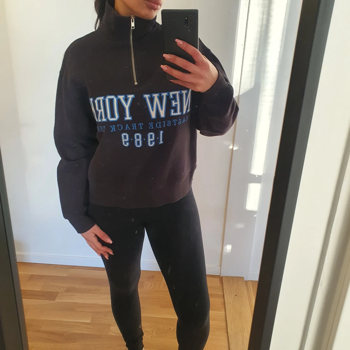 Säljer en svart oversized sweatshirt med texten 'New York Eastside Track Team 1989' i blått och vitt från Gina tricot. Tröjan har en dragkedja och långa ärmar, perfekt för en avslappnad stil nu under vintern. Stl.Xxs Går även att användas som Xs, S & M