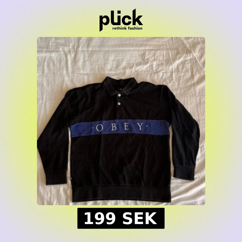 Svart långärmad pikétröja från OBEY med blå panel över bröstet och vit OBEY-logga. Tröjan har klassisk krage och knäppning med två knappar framtill. Perfekt för en stilren och avslappnad look.