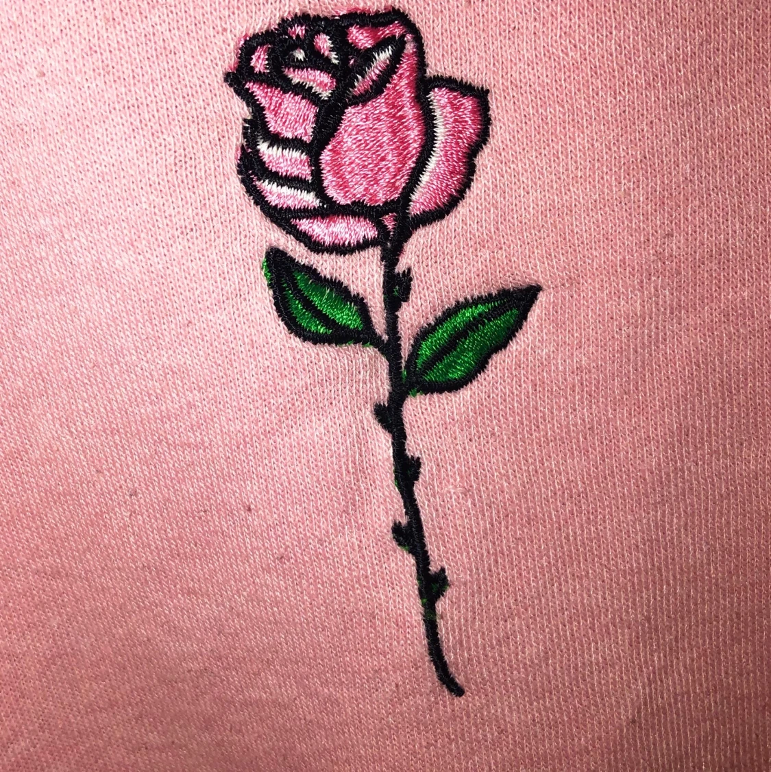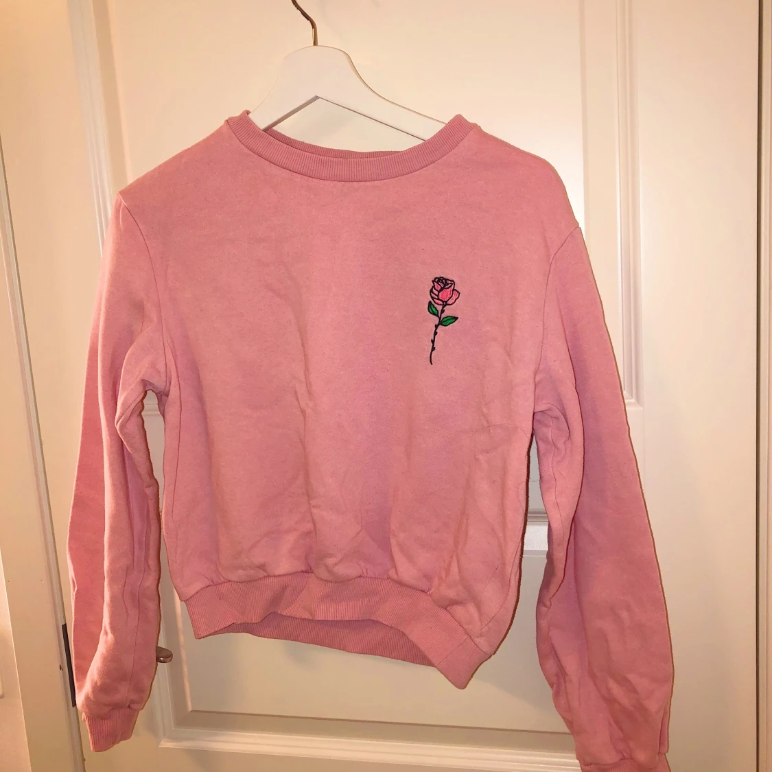 Rosa sweatshirt med en ros på, superfin färg och knappt använd. Är i storlek XS men passar även en S. 50kr plus frakt eller bud!!