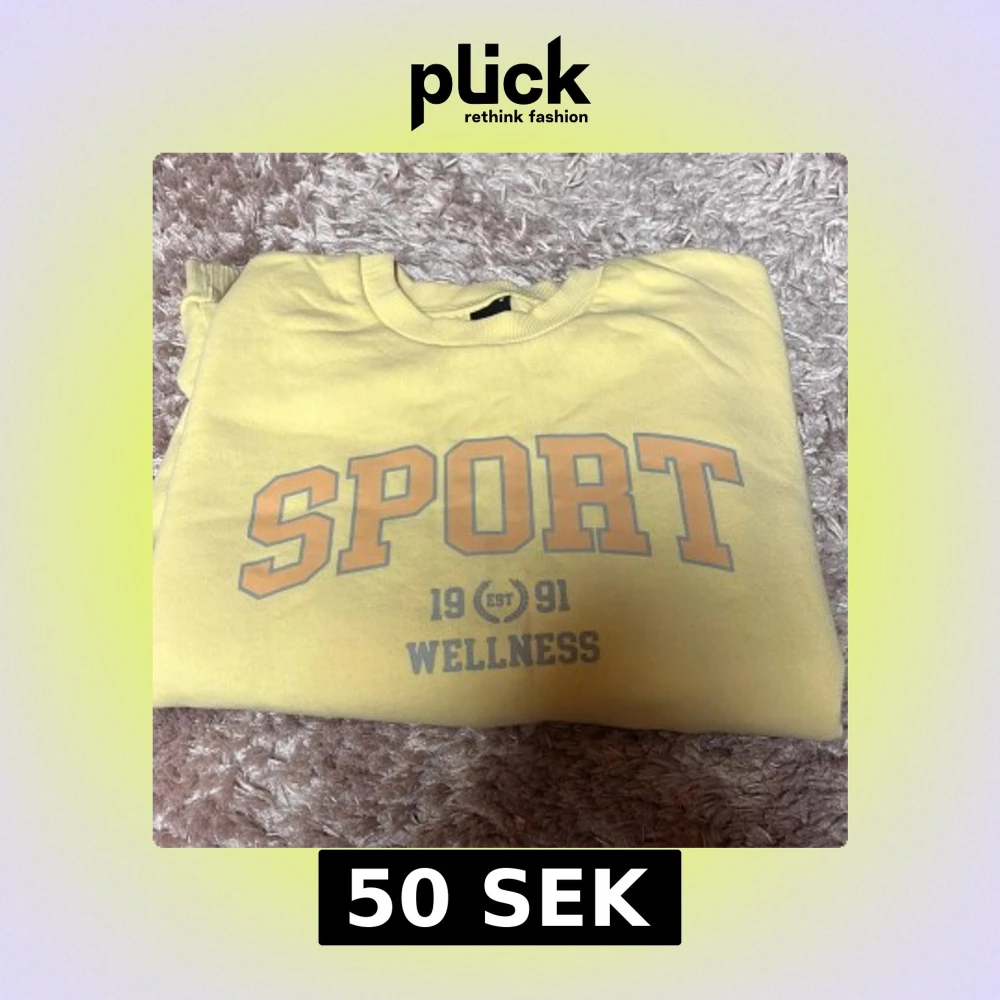 Säljer en ljusgul sweatshirt med trycket 'SPORT 1991 WELLNESS' framtill. Tröjan har rund halsringning och långa ärmar. Den är köpt från Gina och är i storlek Medium.