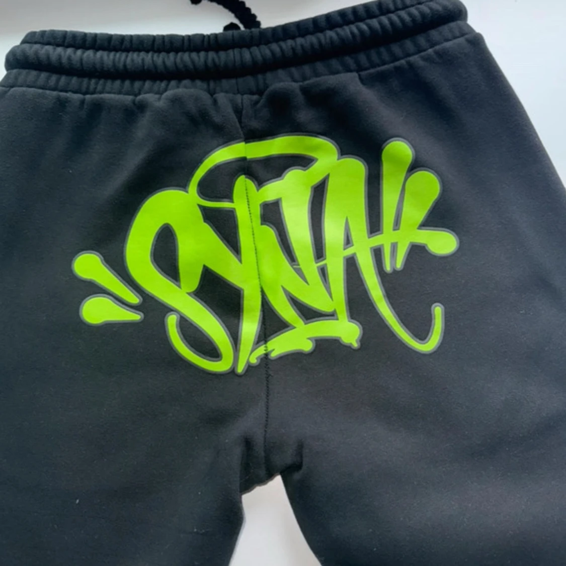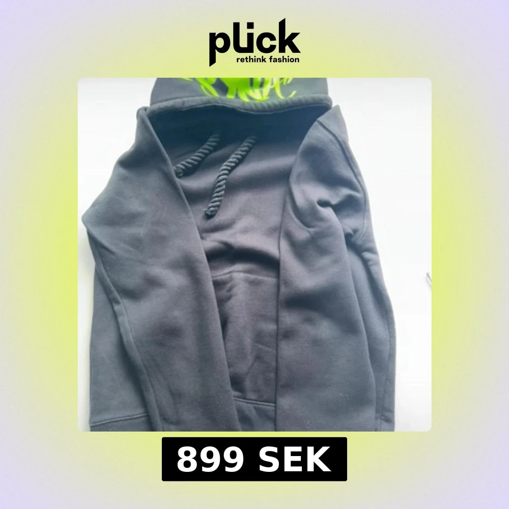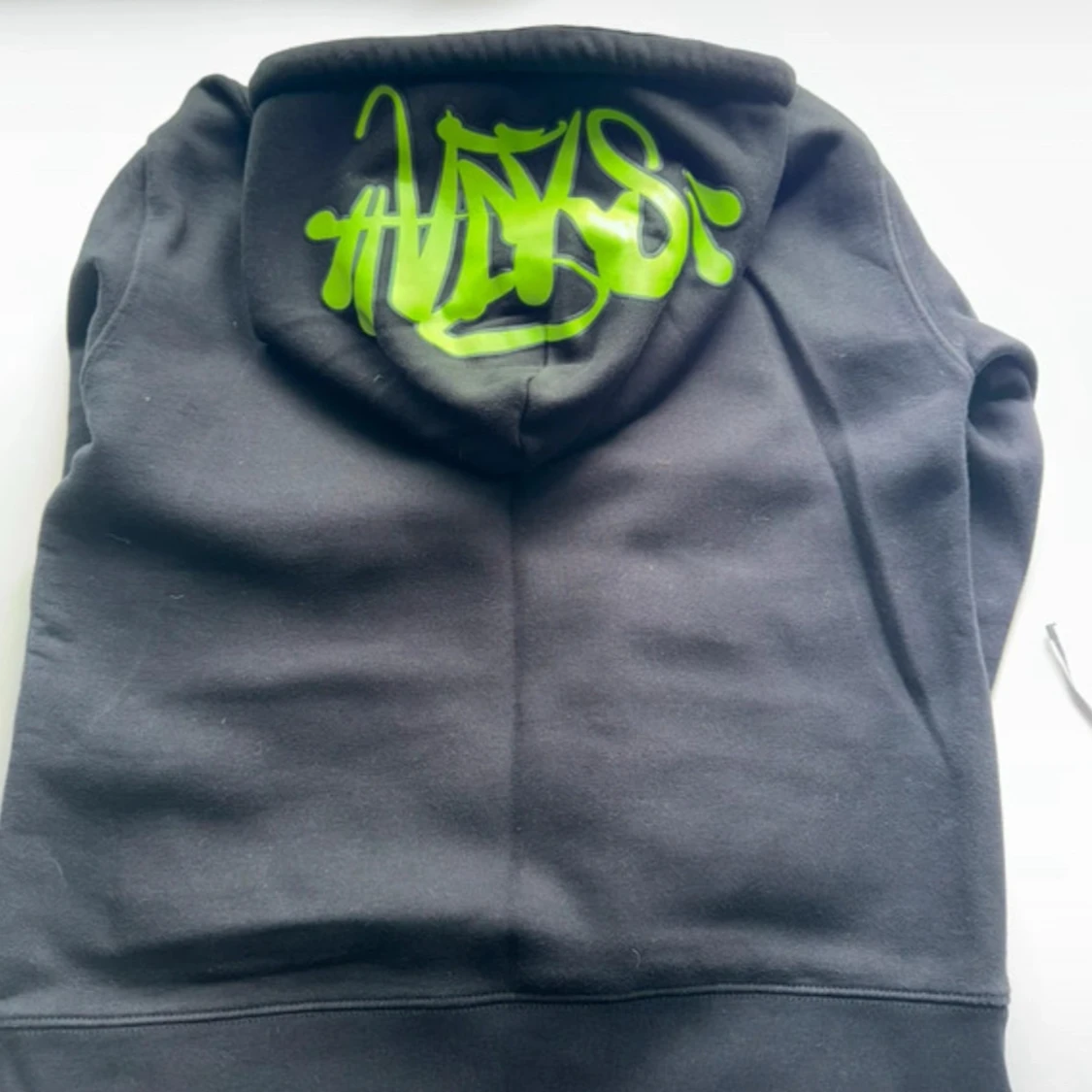 Svart hoodie från SNAK med fet grön graffiti-tryck på huvan och ryggen. Tröjan har huva med snörning och är tillverkad i mjukt material, perfekt för chill eller streetwear. Klassisk känguruficka framtill och cool urban vibe.