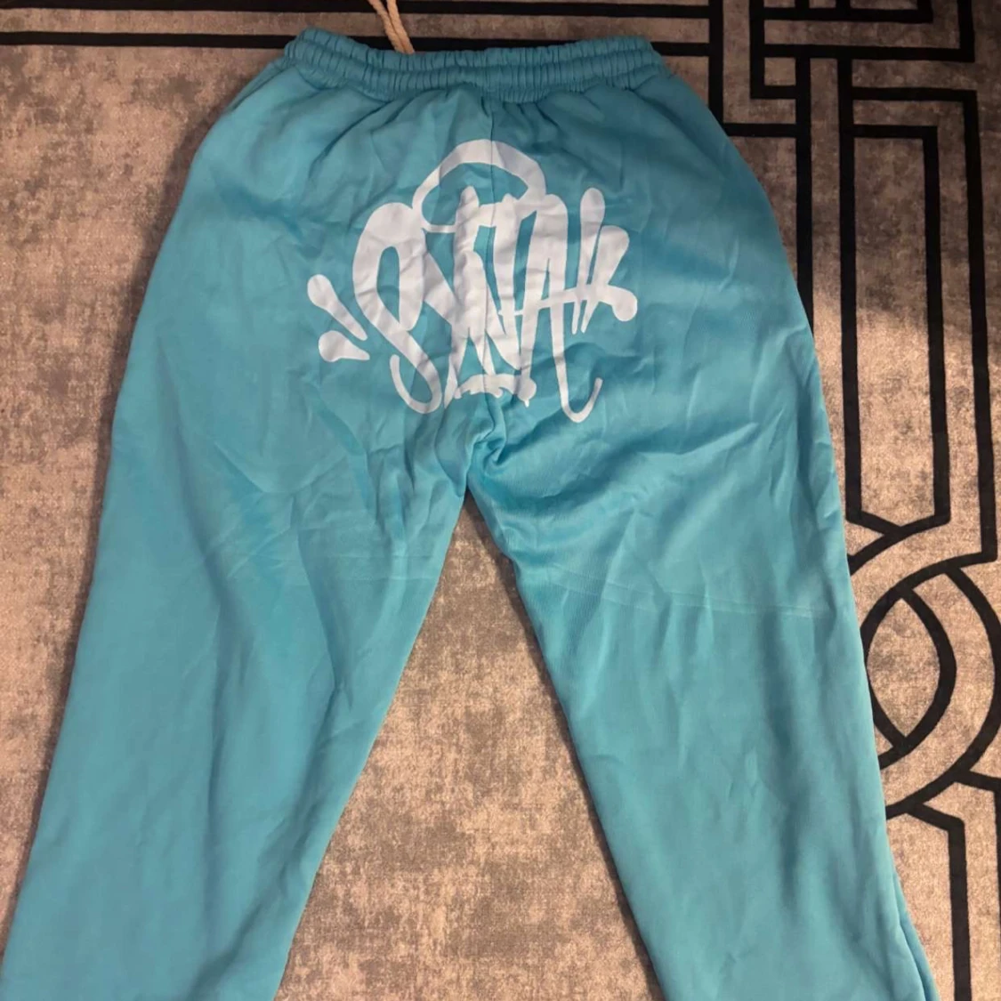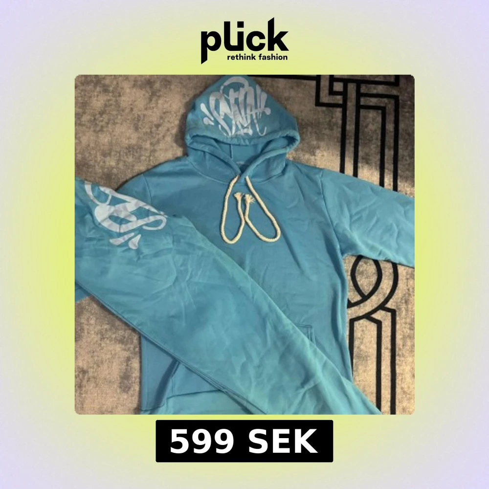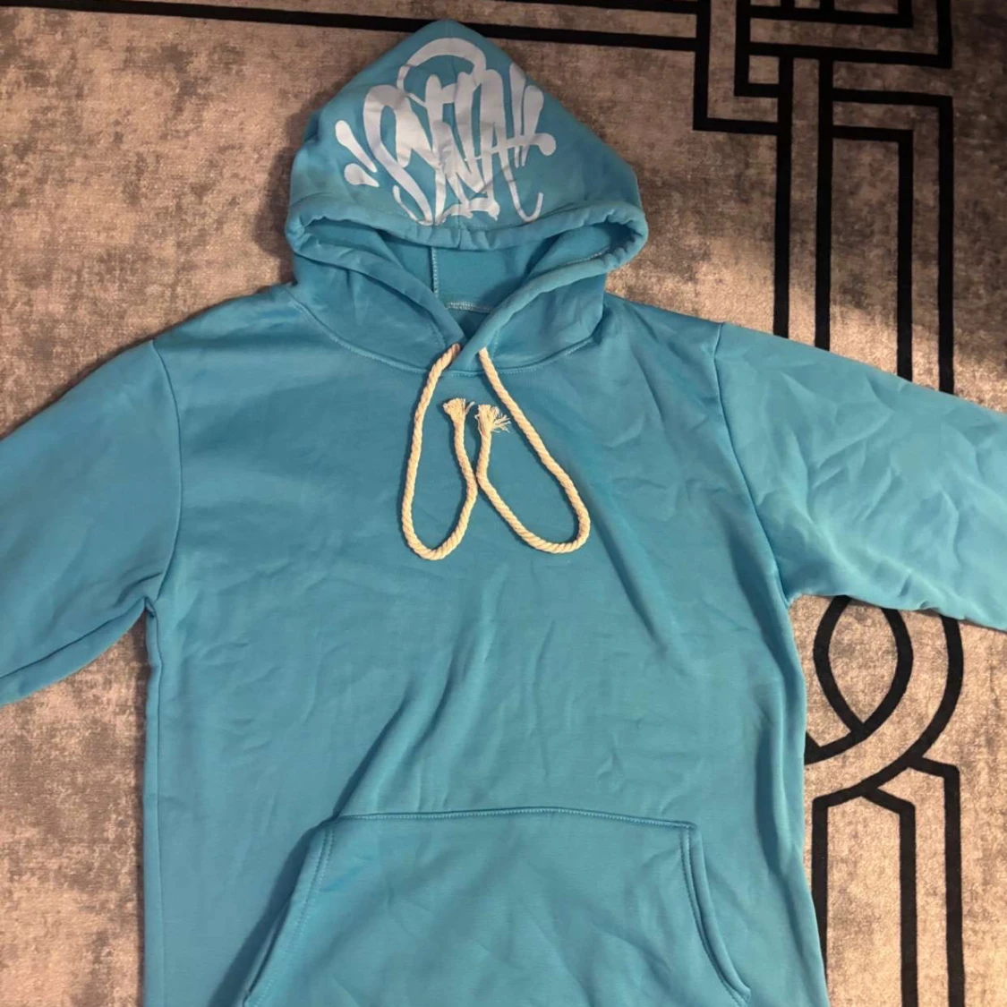 Säljer en turkos hoodie med vit graffiti-inspirerat tryck på huvan och ena ärmen. Tröjan har en stor känguruficka framtill och grova rep som snörning i huvan. Perfekt för dig som gillar streetwear och vill sticka ut med en färgglad look.