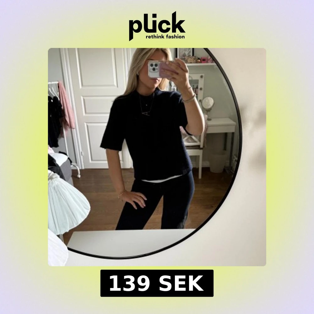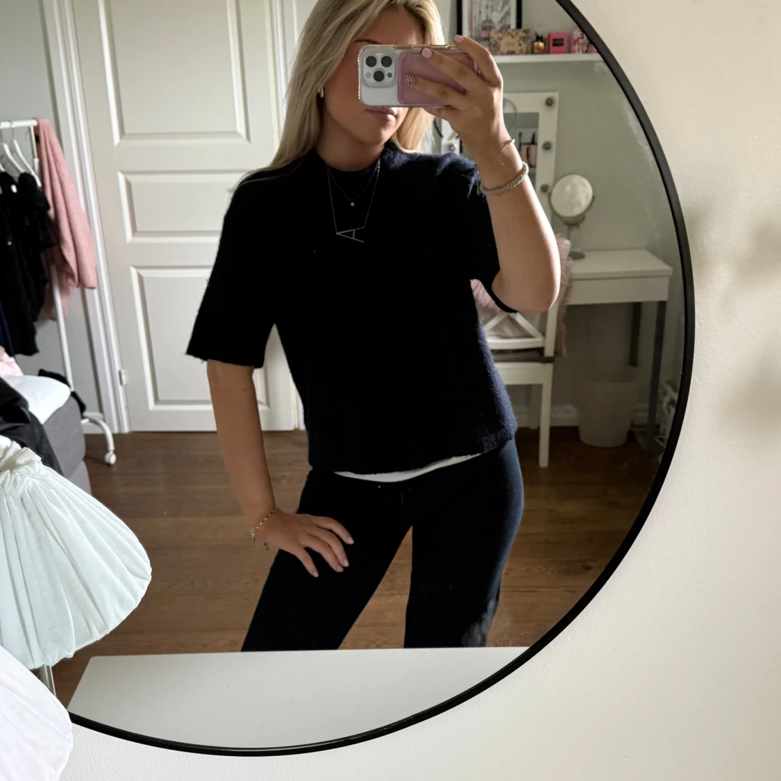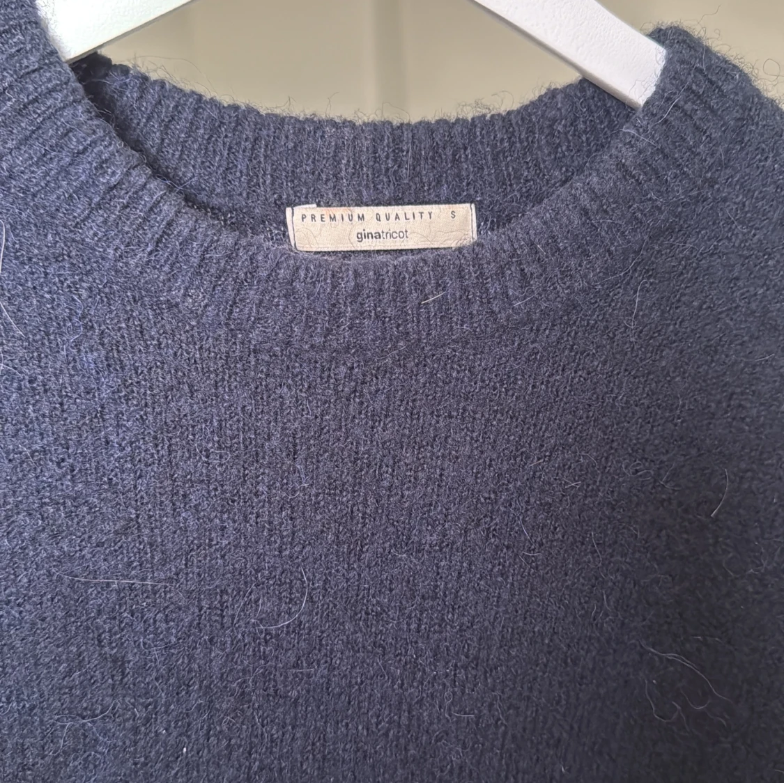 Säljer en mörkblå stickad tröja från Gina Tricot med rund halsringning och kortare ärmar. Tröjan har en enkel och stilren design, perfekt att matcha med jeans eller kjol. Supermjuk och skön att bära.