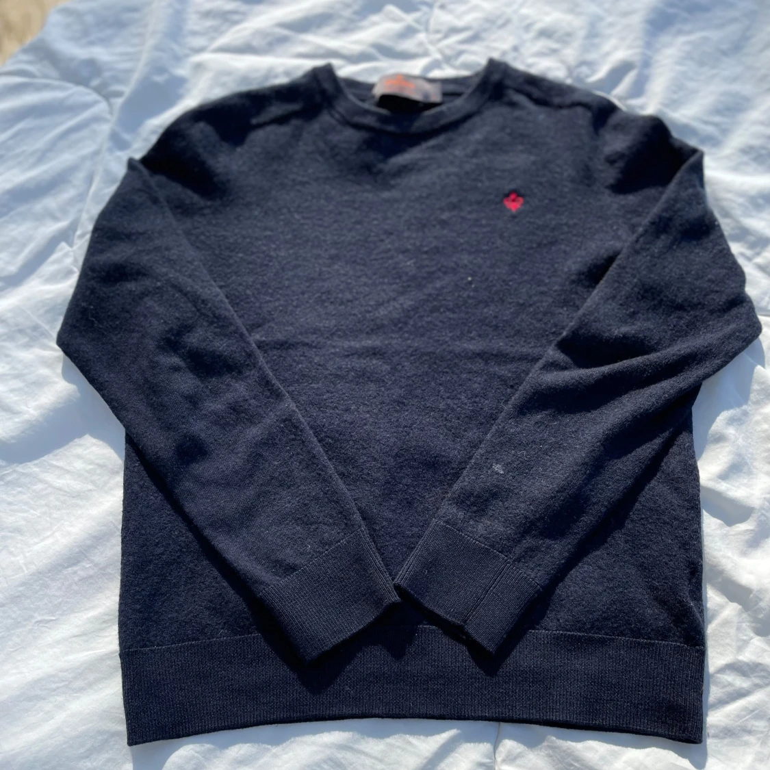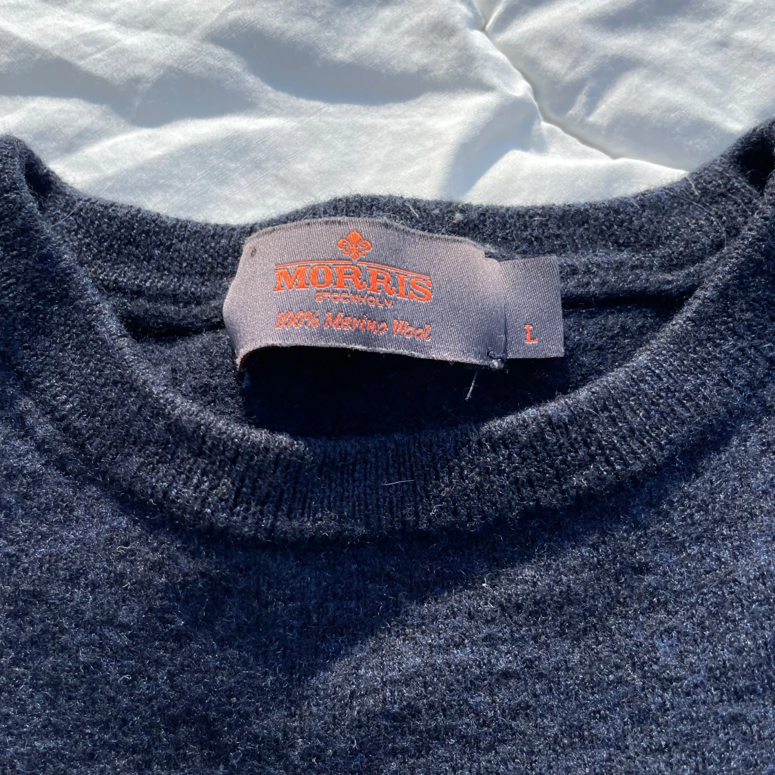Säljer en stilren mörkblå tröja från Morris i 100% merinoull. Tröjan har en liten röd broderad detalj på bröstet och långa ärmar. Perfekt för kyligare dagar. Hör av dig vid intresse! 💙obs dålig sista bild kan få nya om du skriver till mig😊