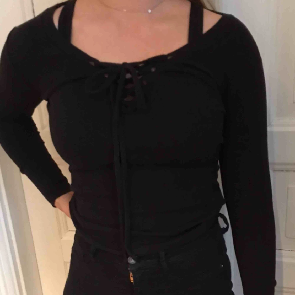 Svart långärmad, med snören vid bysten. Passar XS till M