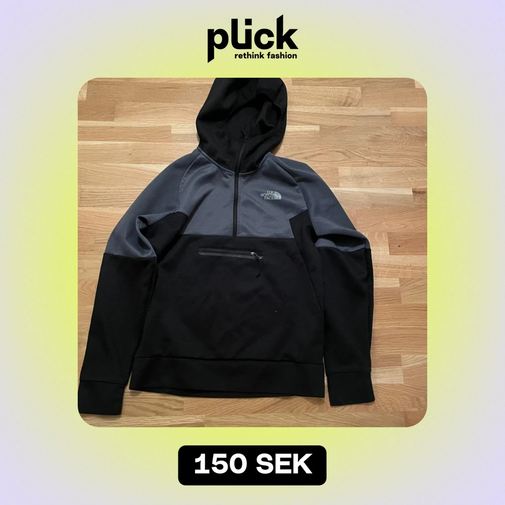 Säljer en snygg och bekväm hoodie från The North Face i svart och grått. Den har en halv dragkedja framtill och en praktisk ficka med dragkedja på magen. Perfekt för kyliga dagar eller som ett extra lager under jackan.