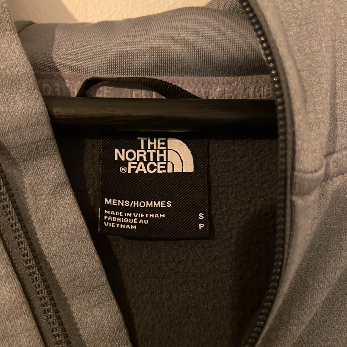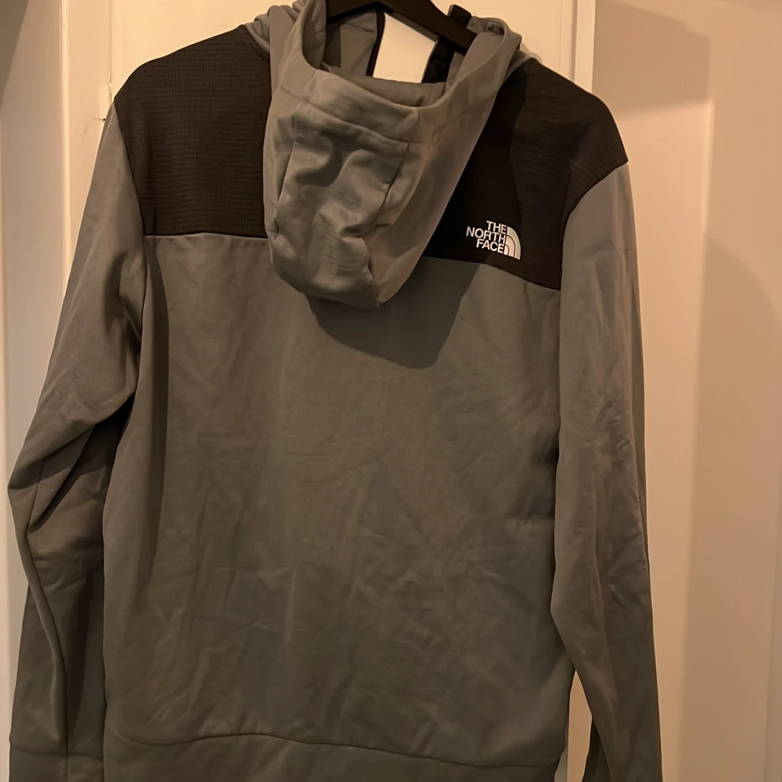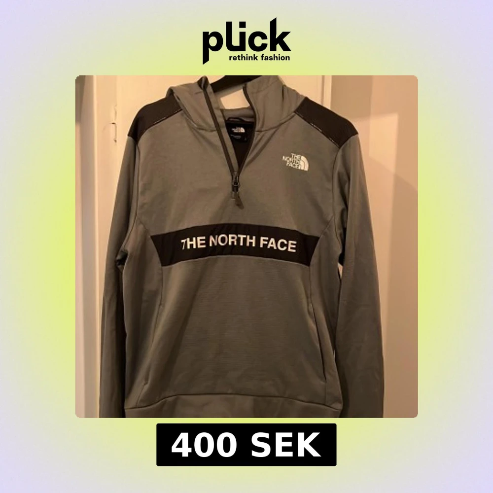 Snygg grå hoodie från The North Face med svart panel och vit logga framtill. Tröjan har huva, halv dragkedja och långa ärmar. Perfekt för chill eller träning, med sportig look och bekväm passform.