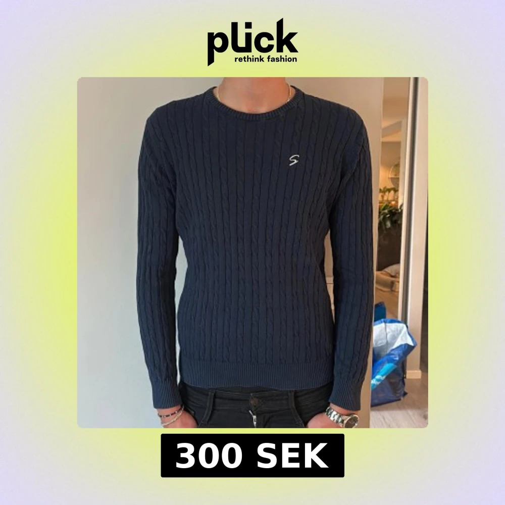 Mörkblå kabelstickad tröja från Skill med rund hals och diskret broderad S på bröstet. Tröjan har ribbade muddar och är långärmad, perfekt för lager-på-lager. Skön och klassisk stil som funkar året runt.