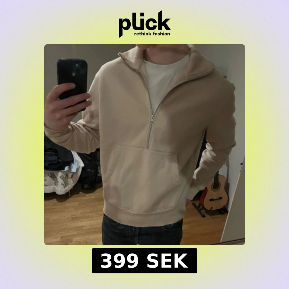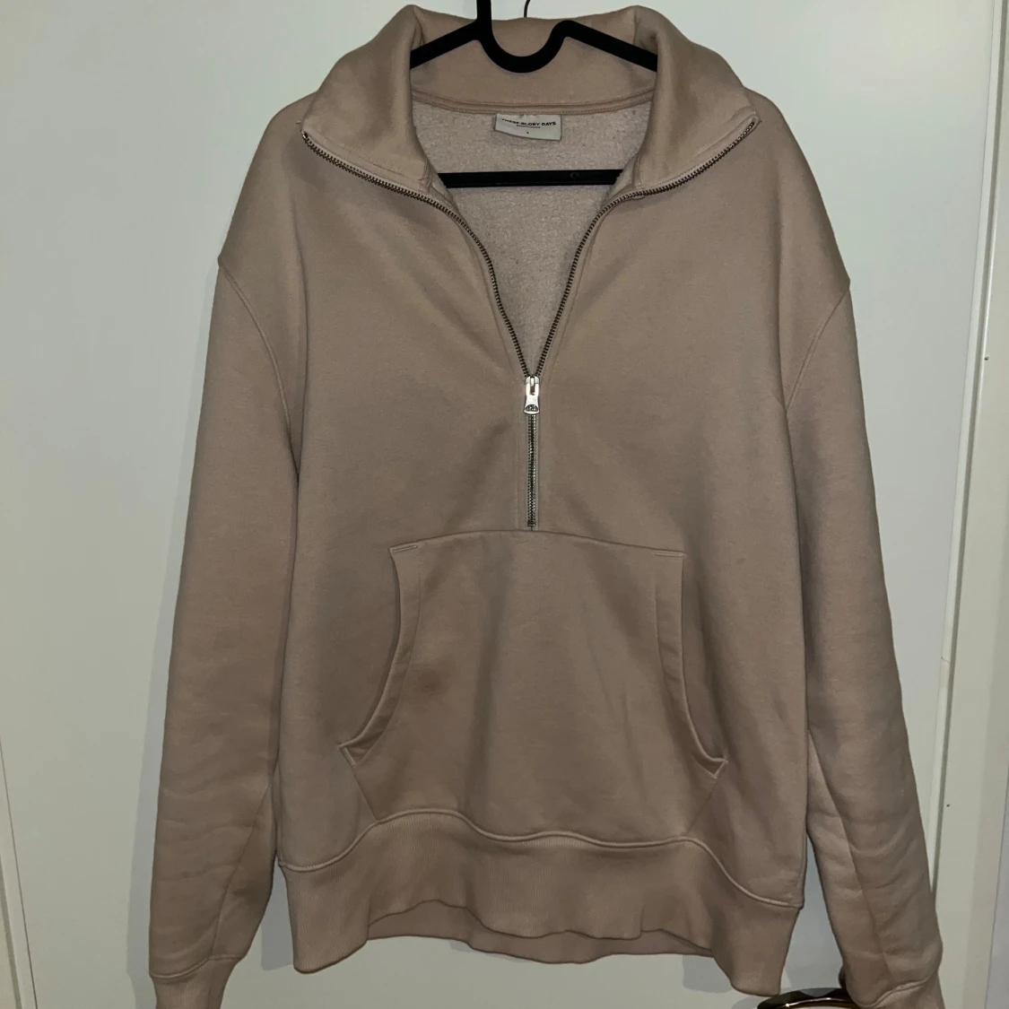 Säljer en beige hoodie med halv dragkedja och stor magficka. Tröjan har hög krage och är tillverkad i mjukt material, perfekt för en avslappnad stil. Passformen är normal och ärmarna är långa.
