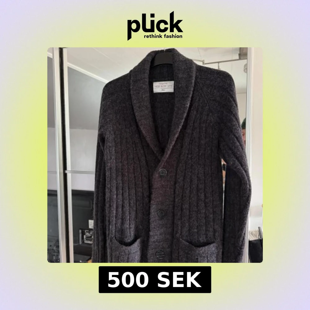 Säljer en stilren mörkgrå kofta från These Glory Days. Koftan har en ribbad design med långa ärmar och två fickor framtill. Stl M