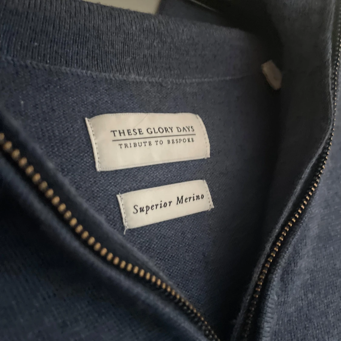 Snygg mörkblå merinoull halv zip tröja från These Glory Days. Perfekt . Tröjan har långa ärmar, priset är inte hugget , fråga efter extra bilder ✅
