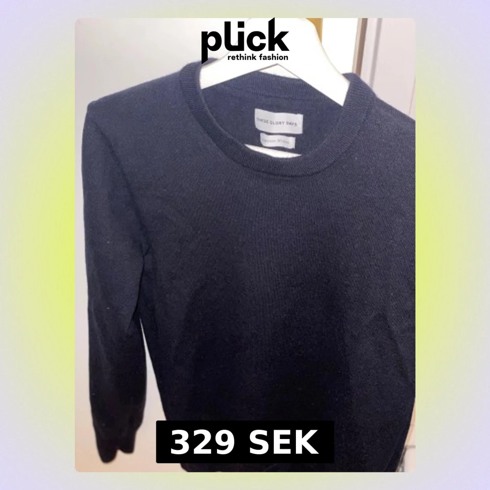 Snygg mörkblå stickad tröja från These Glory Days i 100% merinoull. Tröjan är endast använd typ 3 gånger, sedan råkade morsan tvätta den så den blev för liten. Tröjan är alltså i otroligt bra skick. Egentligen är storleken M, men den passar alltså XS eller S också möjligtvis.