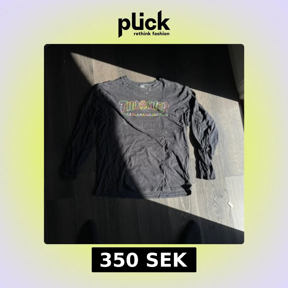 Svart långärmad tröja från Thrasher med färgglatt tryck på bröstet där det står 'Thrasher San Francisco'. Skön passform och perfekt för dig som gillar streetwear. Klassisk crewneck och mjukt bomullsmaterial.