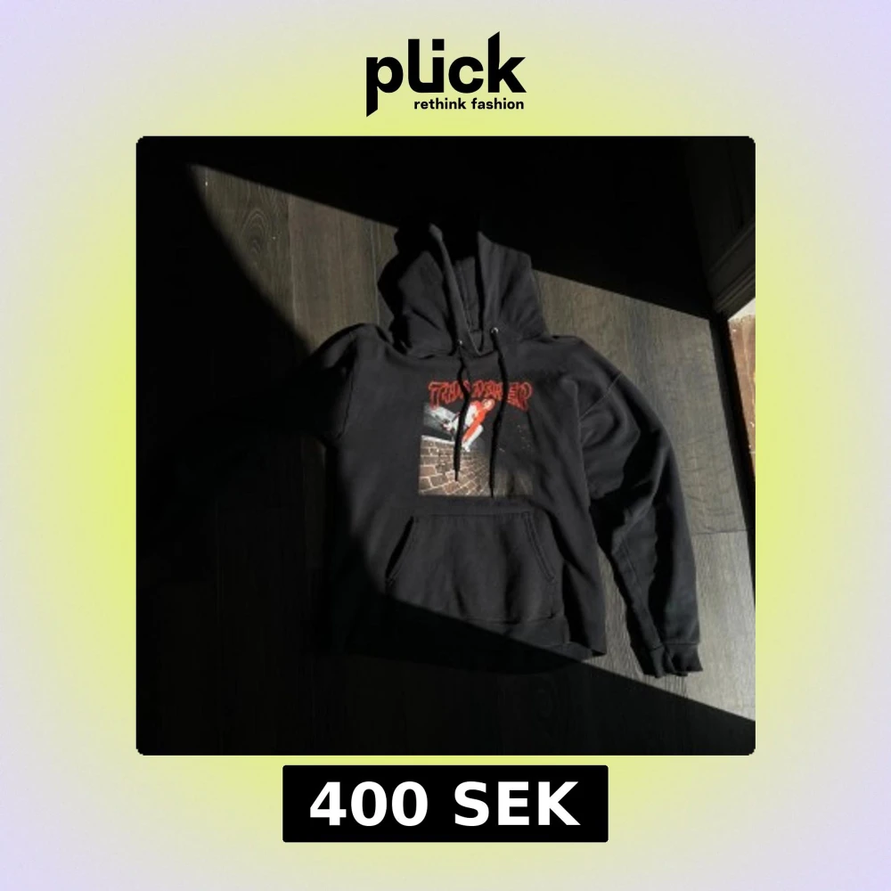 Svart hoodie från Thrasher med fett tryck framtill i rött och en bild på en skateboardåkare. Klassisk känguruficka och snörning i huvan. Perfekt för dig som gillar streetstyle och skatevibes.