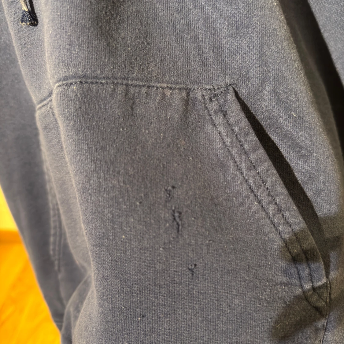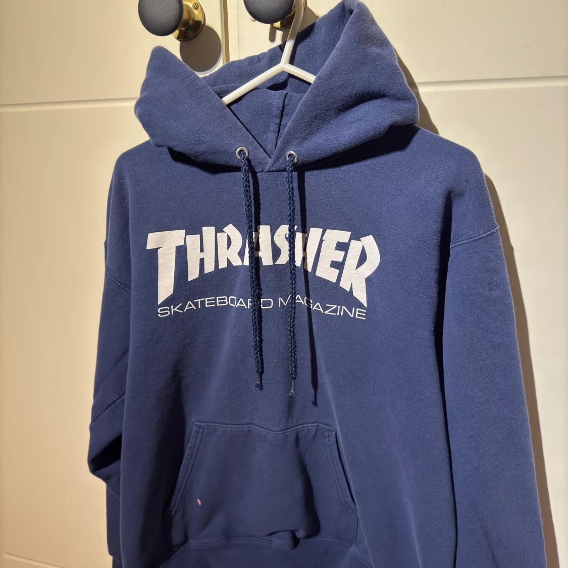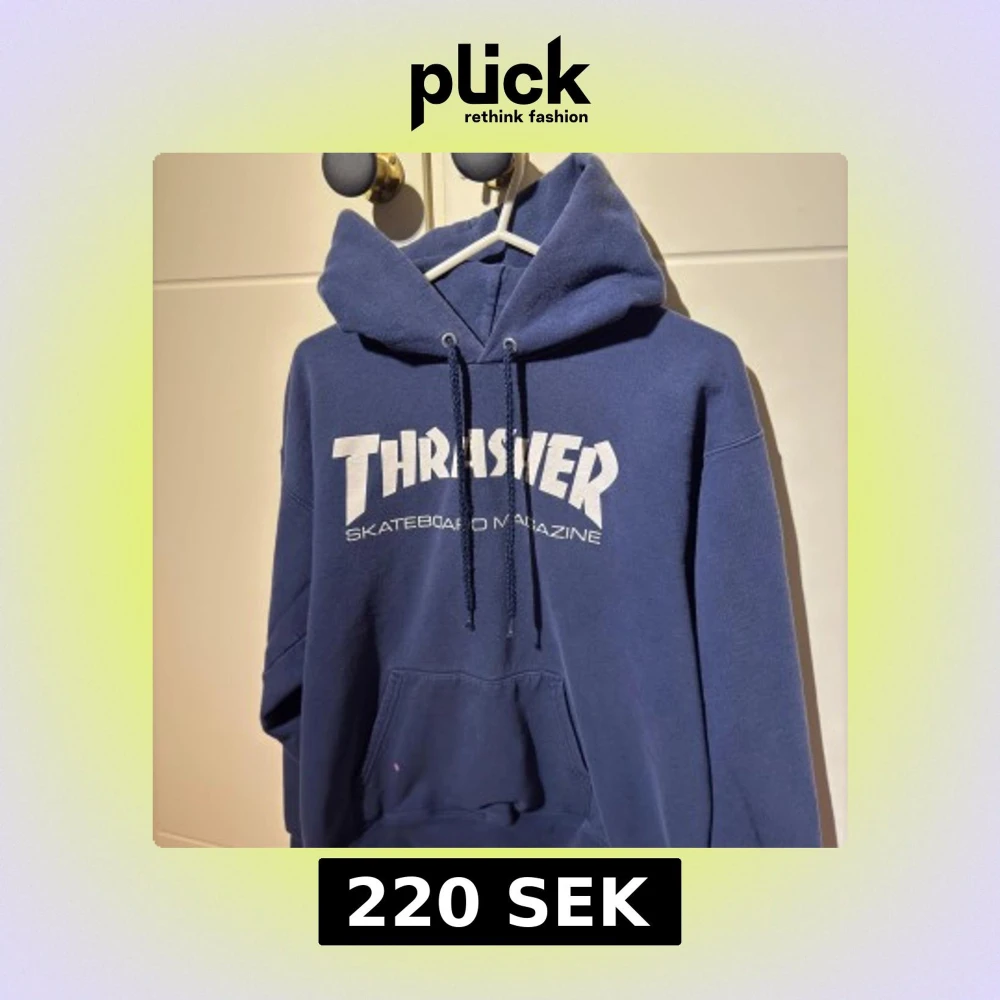 Säljer en blå hoodie från Thrasher med vit text på bröstet. Hoodien har en liten fläck som inte går bort och sen liten rivning men annars är den i bra skick och inga andra skador på den. Den är i storlek S.