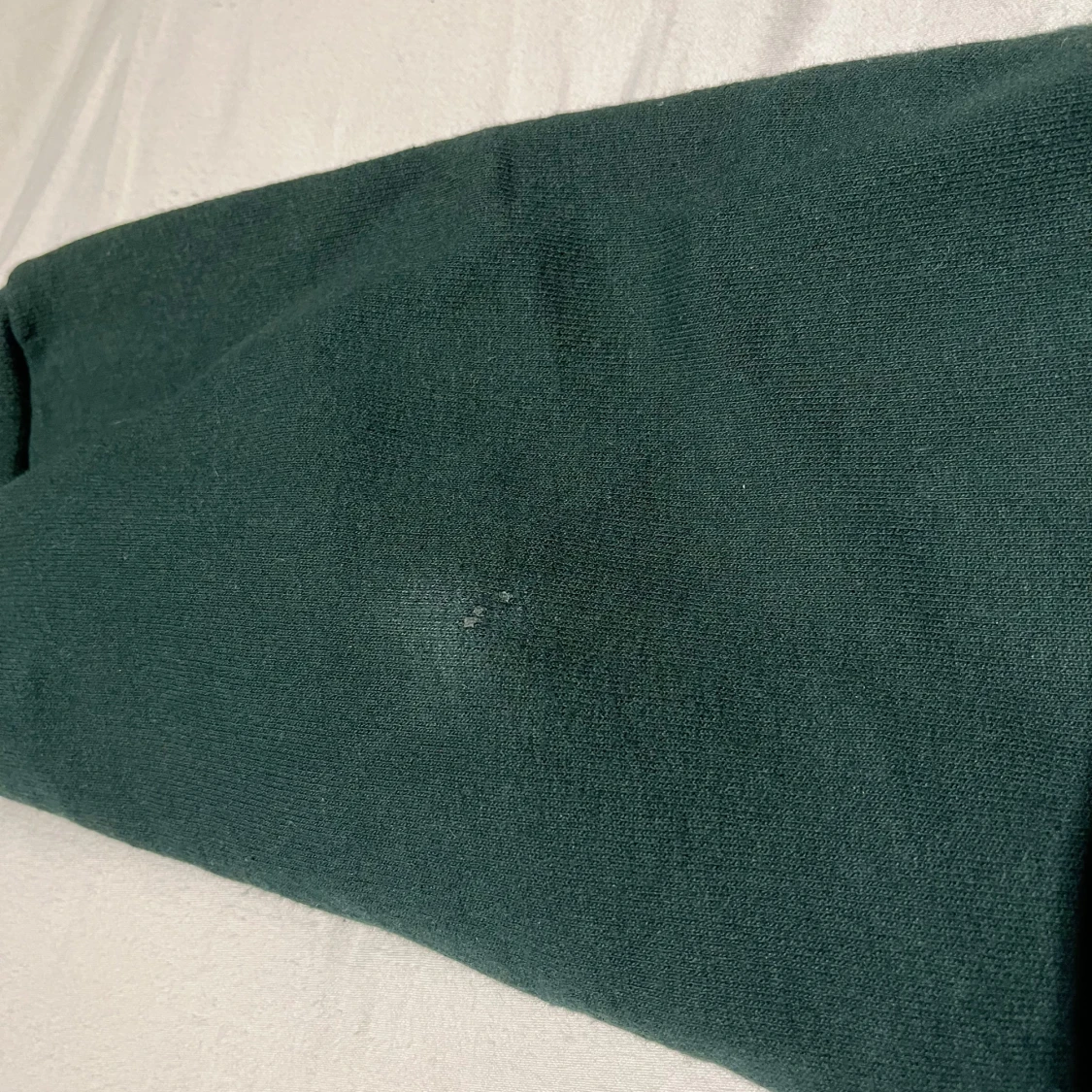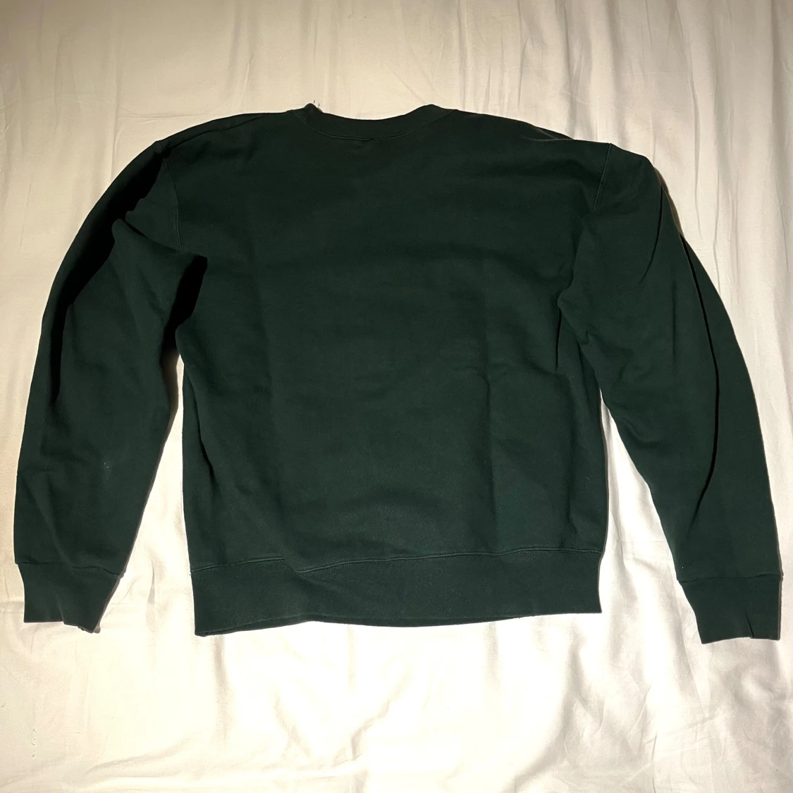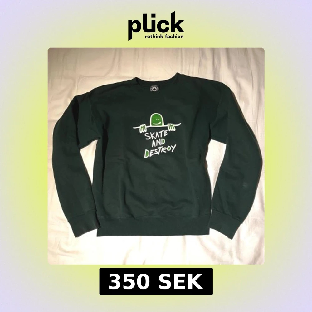 Säljer en grön sweatshirt med ett coolt tryck 'Skate and Destroy' på framsidan. Tröjan har långa ärmar och är perfekt för en avslappnad stil. Den är gjord i ett mjukt material. Den har en liten fläck på under armen.