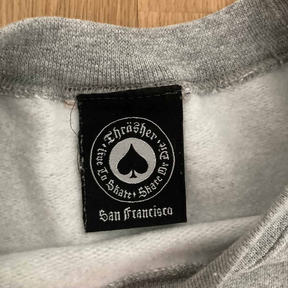 Grå Thrasher sweatshirt. Använd fåtal gånger och i jättebra skick. Storlek L. Nypris 800kr. Skriv privat för fler bilder.
