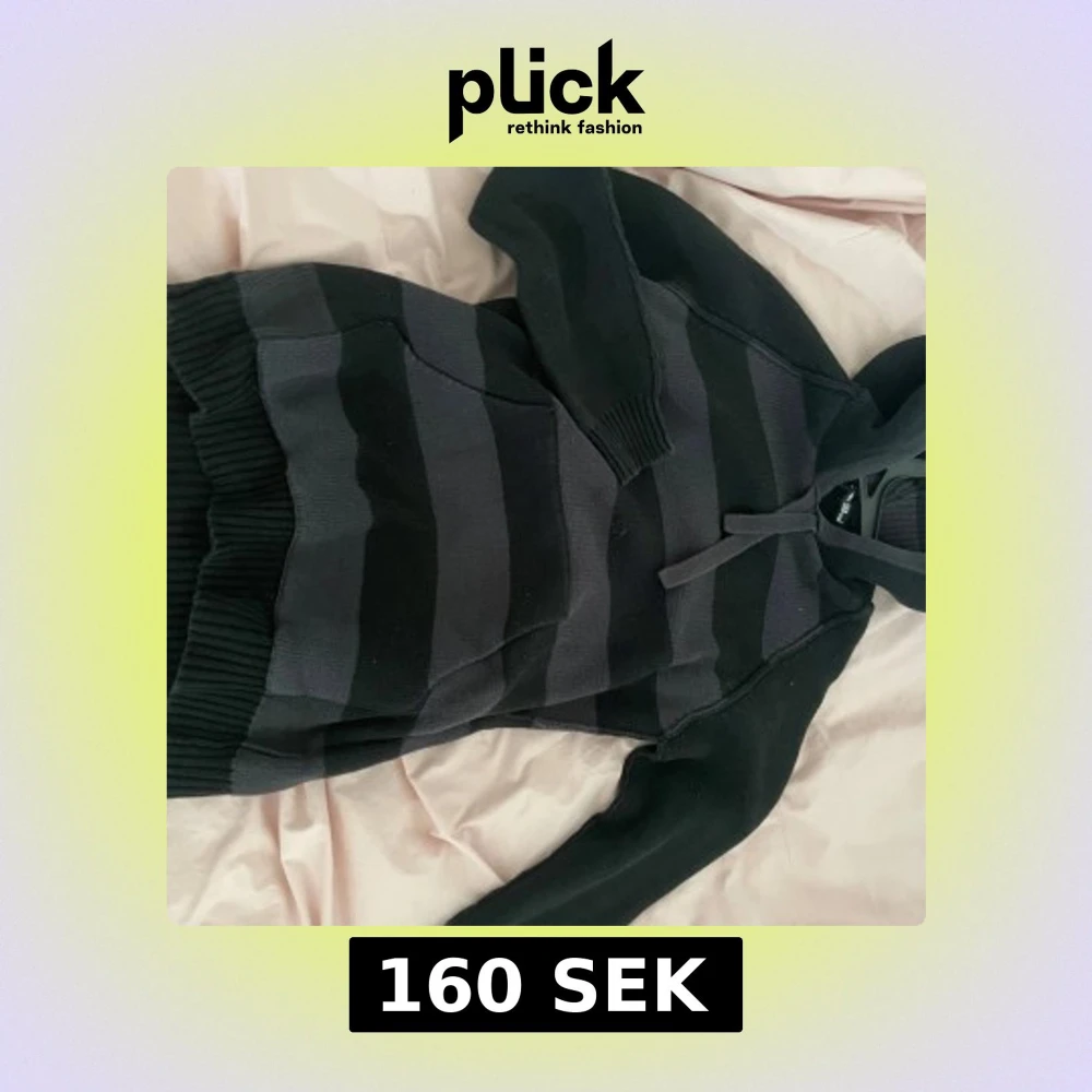 Säljer en svart och grå randig hoodie . Den har en klassisk design med huva och ribbade muddar. Storlek L men den är som en s skulle jag säga