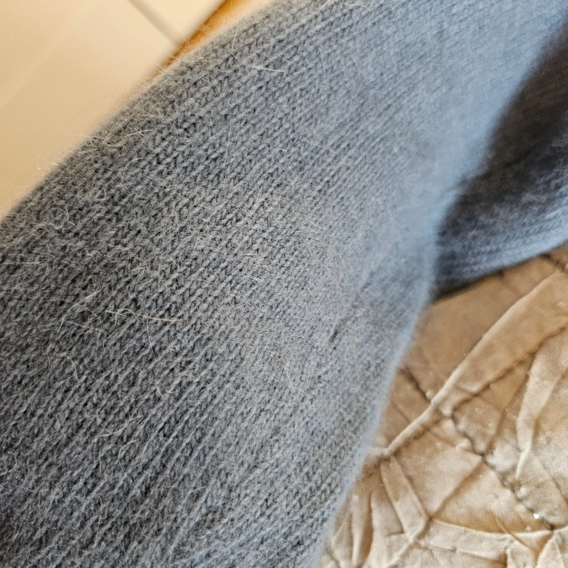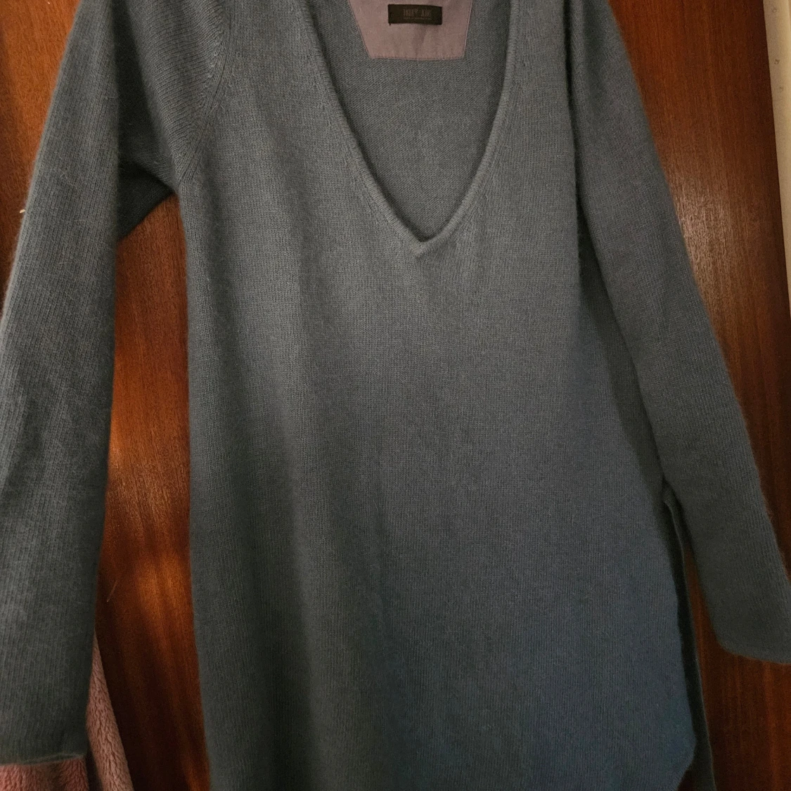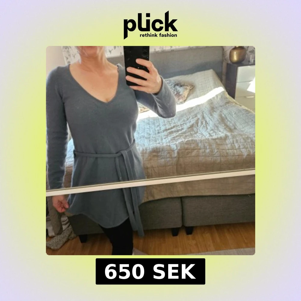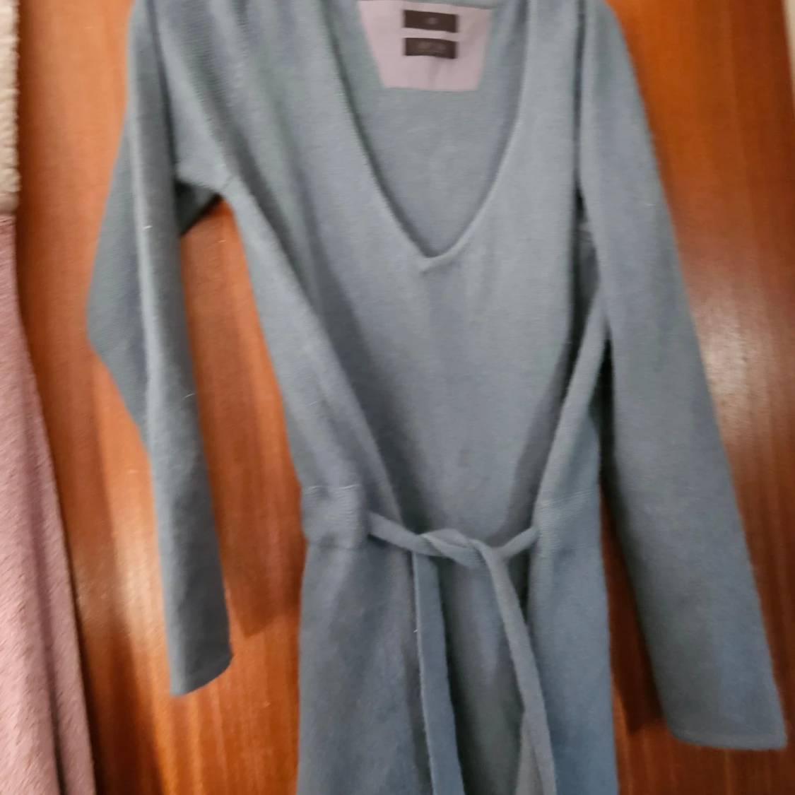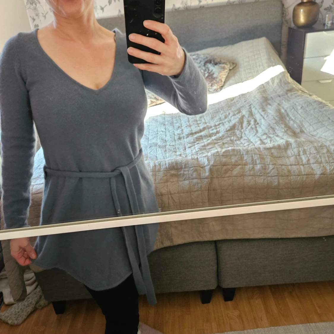 Mysig lblå stickad klänning med v-ringning och knytskärp i midjan. Långärmad och i mjukt material, perfekt för kyligare dagar. Enkel och stilren design som passar till många tillfällen.
