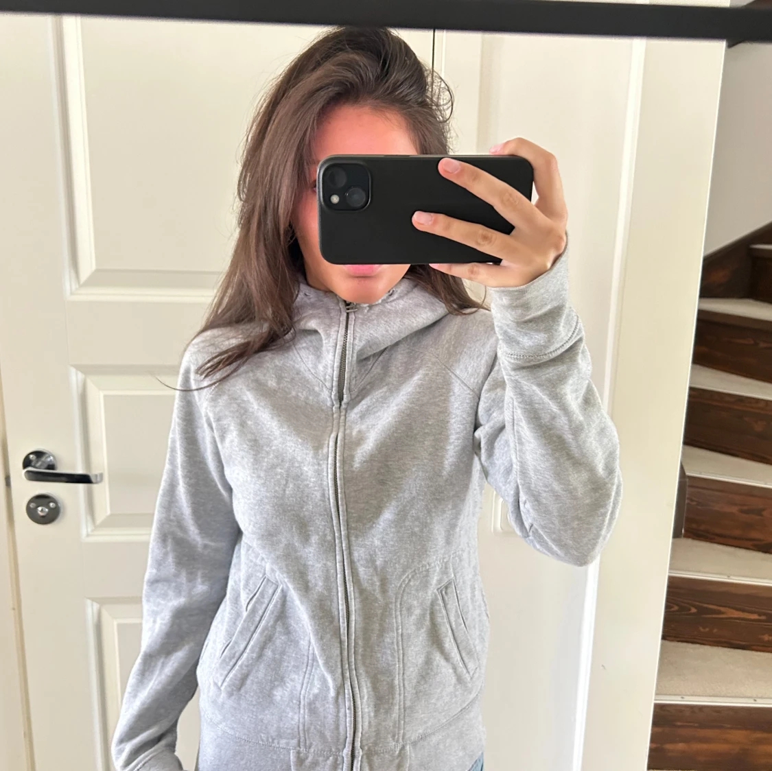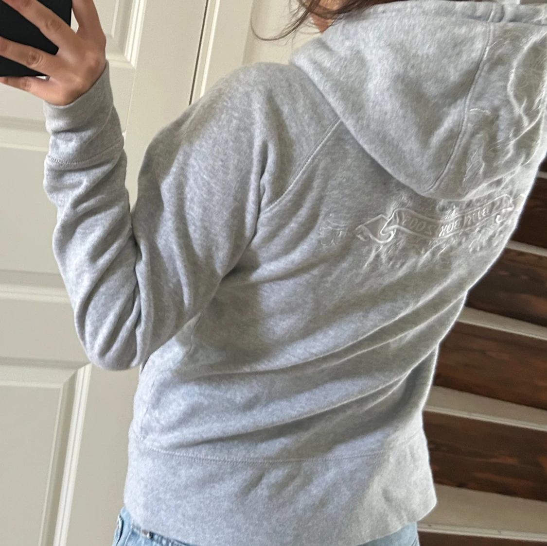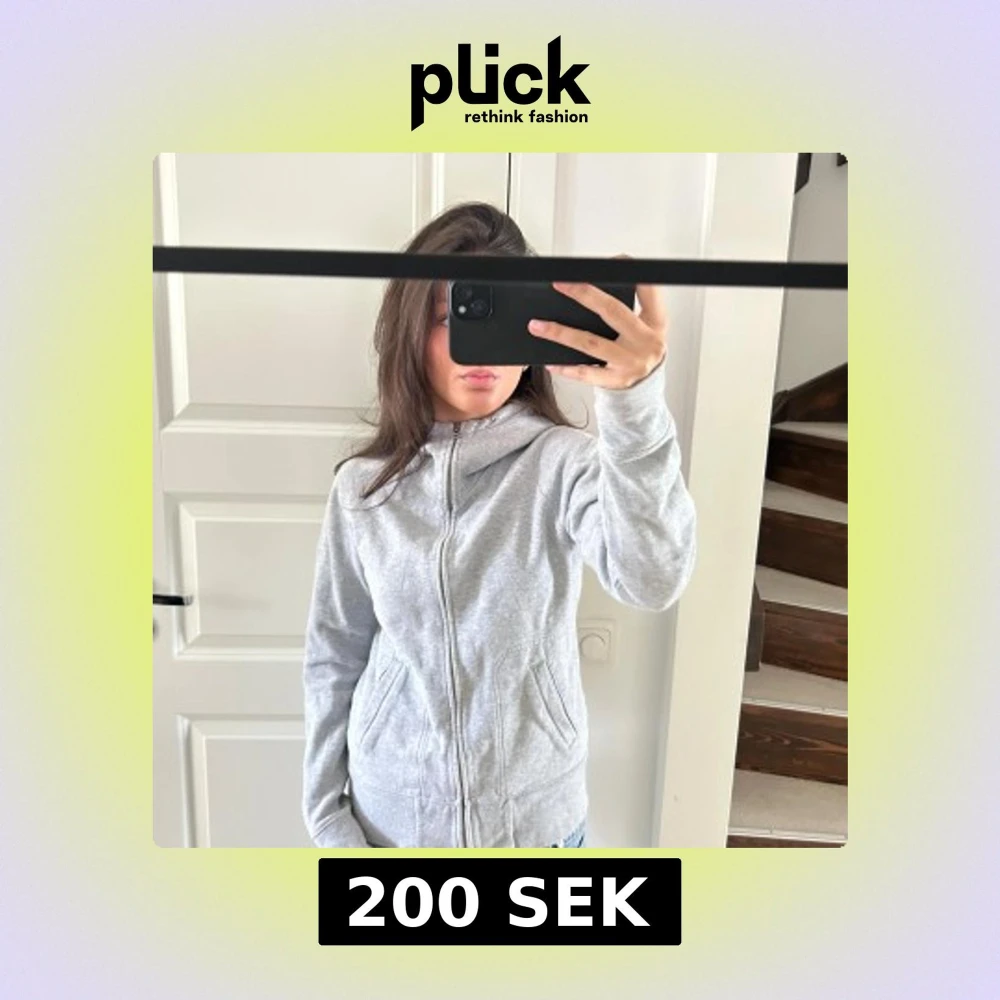 Säljer en ljusgrå hoodie från Bikbok med dragkedja framtill och fickor på sidorna. Tröjan har huva och broderad logga på ryggen. Perfekt för en avslappnad stil.