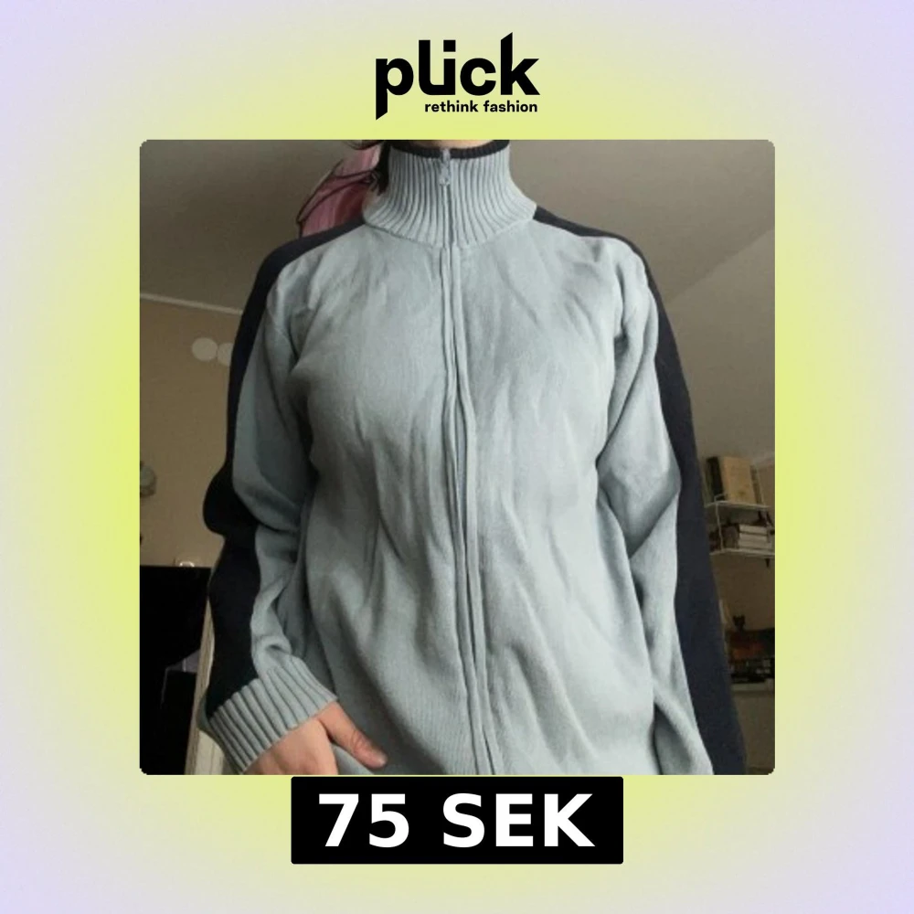 Ljusblå ziptröja med hög krage och mörkblå ränder längs ärmarna. Tröjan är tillverkad i 100% bomull och har ribbade muddar vid ärmslut och nederkant. Perfekt för en avslappnad och sportig stil. Svaga fläckar på höger ärm, se bild 5.
