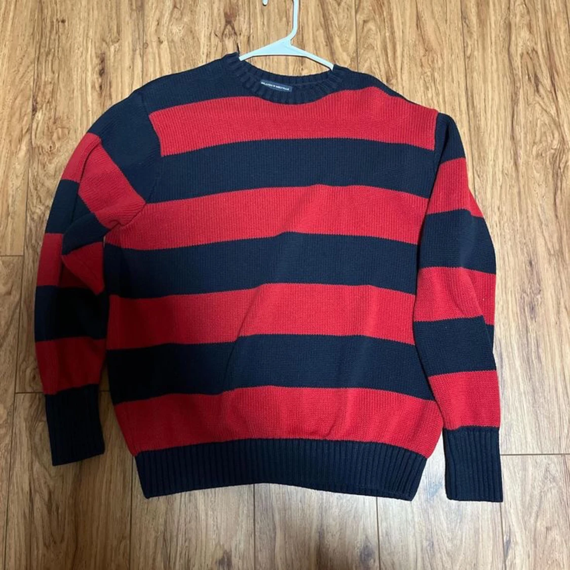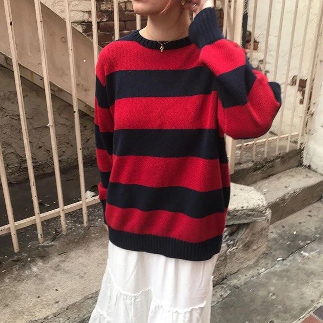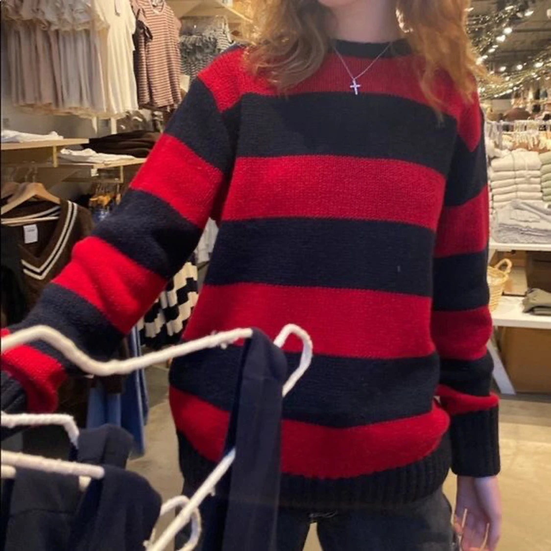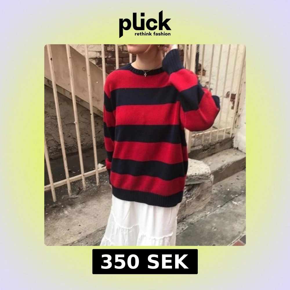 Säljer en oversized stickad tröja med breda röda och marinblå ränder. Tröjan har rund halsringning, långa ärmar och ribbade muddar vid ärmslut och nederkant. Passande till en tidig 2000 tal, downtown girl, vintage, gilmore girls vibe.💗Pris går att diskutera