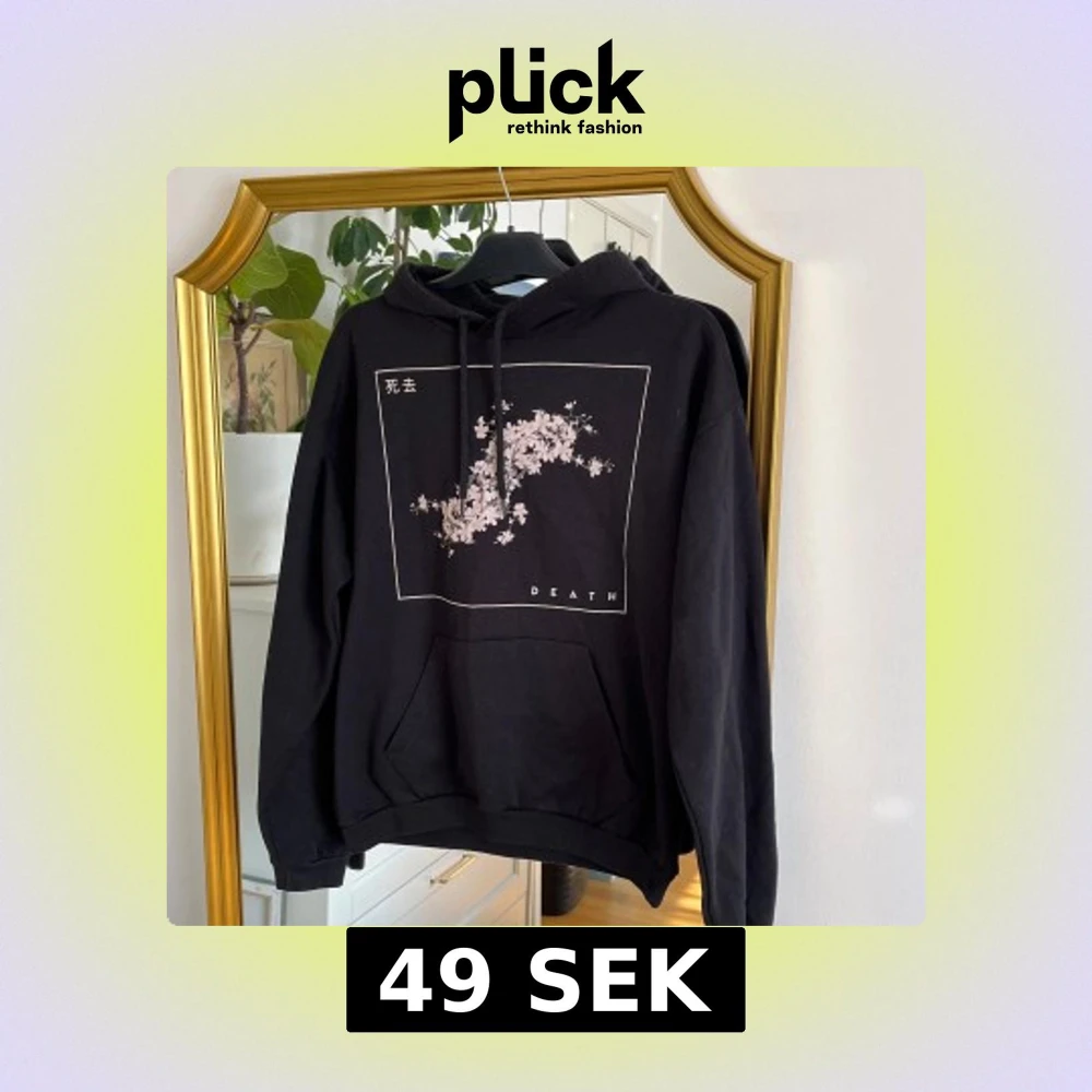 Säljer en svart hoodie från B&C Collection med ett stilrent blommönster i vitt/ljusrosa och texten 'DEATH'. Hoodien har en klassisk passform med känguruficka och justerbar huva. Perfekt för en avslappnad stil.