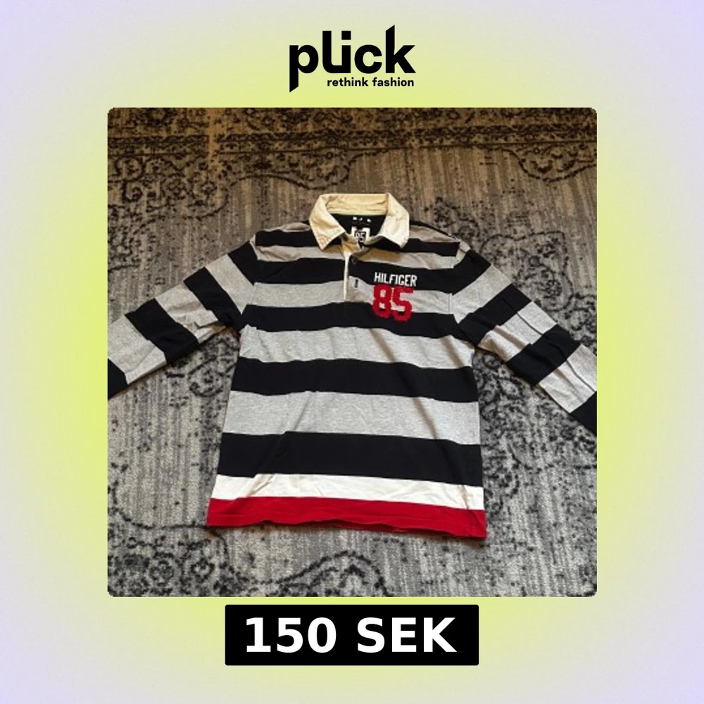 Snygg långärmad pikétröja från Tommy Hilfiger med breda svarta och grå ränder, vit krage och röd detalj längst ner. Broderad Hilfiger-logga och siffran 85 på bröstet. Perfekt för dig som gillar sportig och klassisk stil.